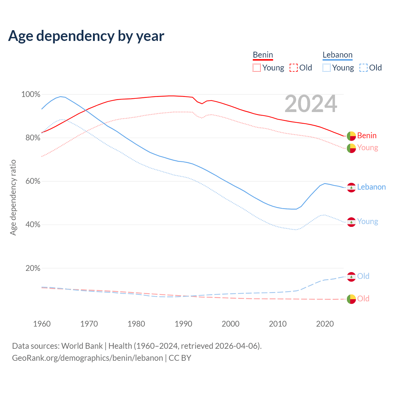- Benin is ranked 179/196 by median age (oldest to youngest) vs 106/196 for Lebanon.
