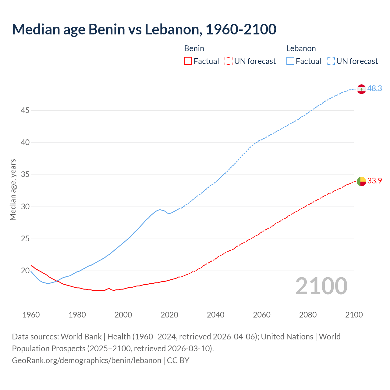 Median age Benin vs Lebanon, 1960-2100