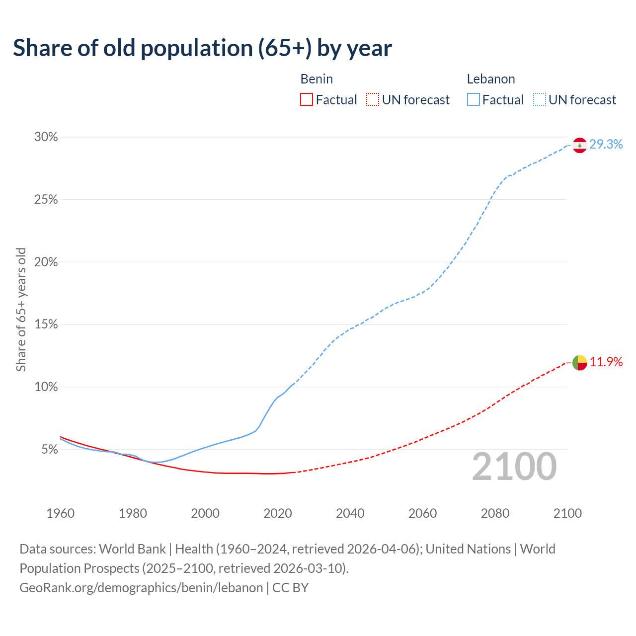 The share of older people aged 65 and over is 3.12% in Benin and 10.1% in Lebanon. Life expectancy in Benin compared to Lebanon .