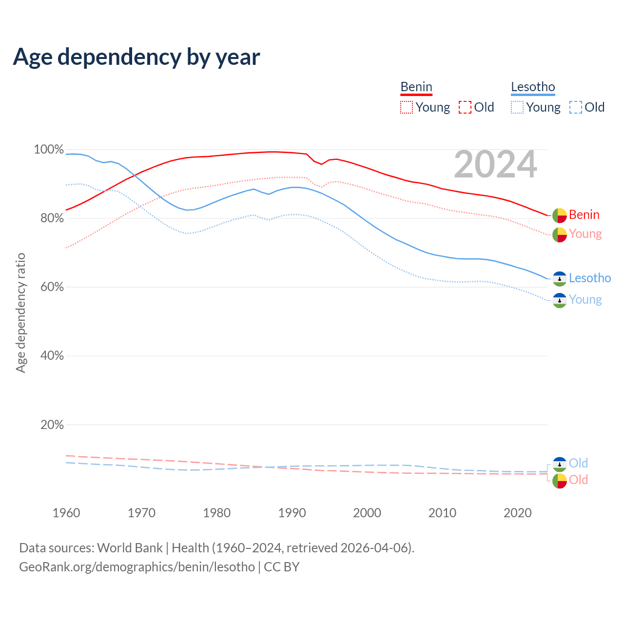 - Benin is ranked 179/196 by median age (oldest to youngest) vs 143/196 for Lesotho.