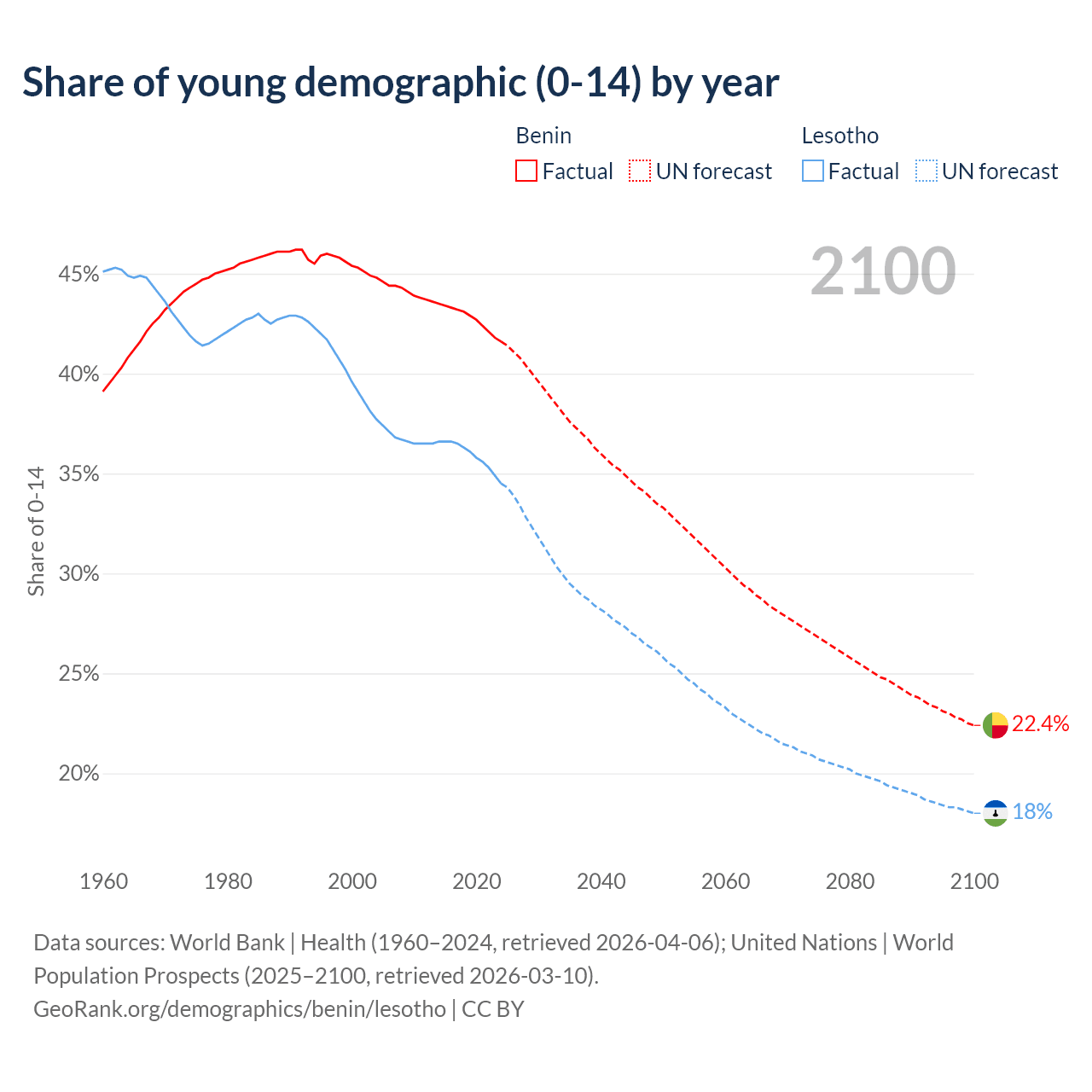 - The share of young demographic (0-15 years old) in Benin is 41.6% vs 34.5% in Lesotho.