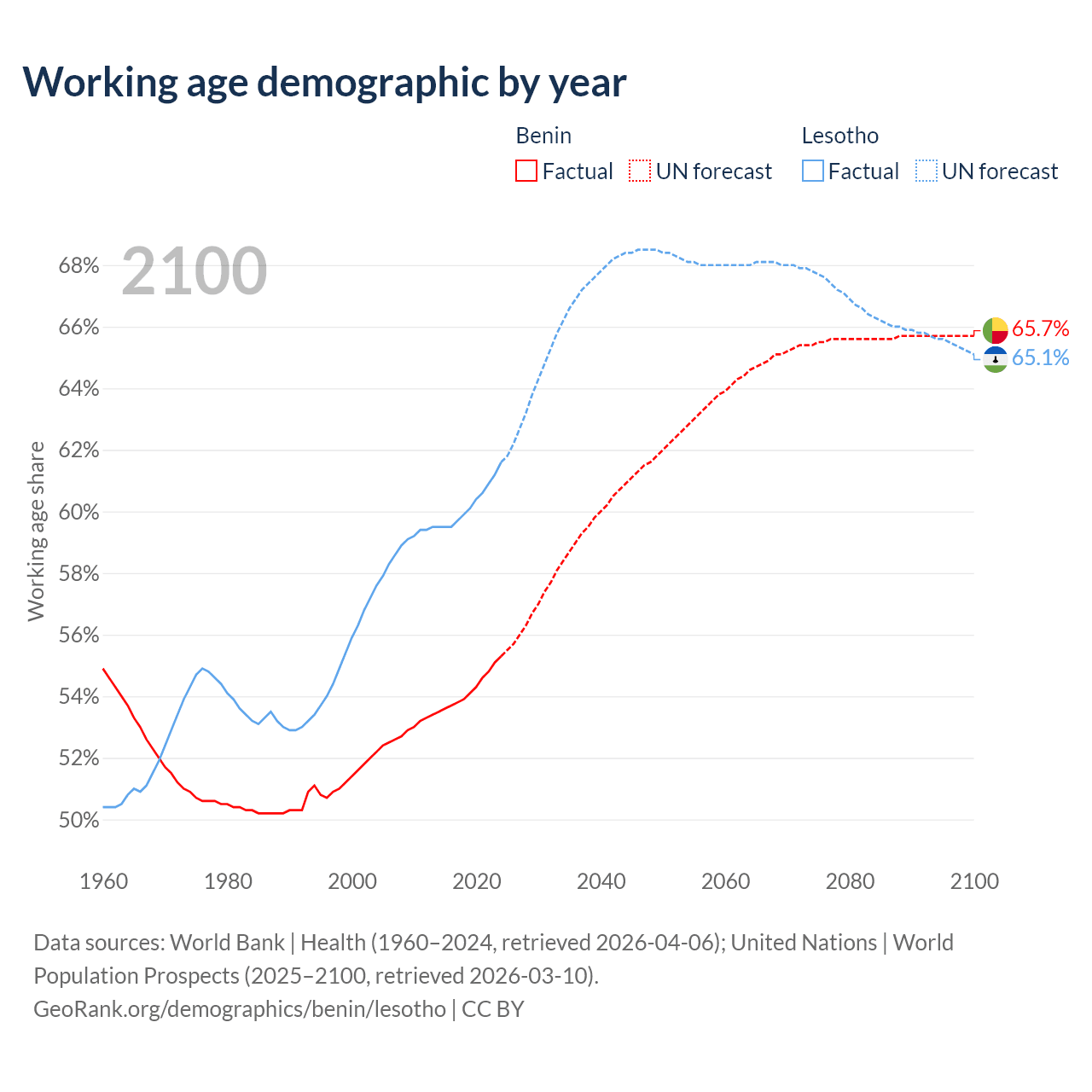 The share of older people aged 65 and over is 3.12% in Benin and 3.86% in Lesotho. Life expectancy in Benin compared to Lesotho .