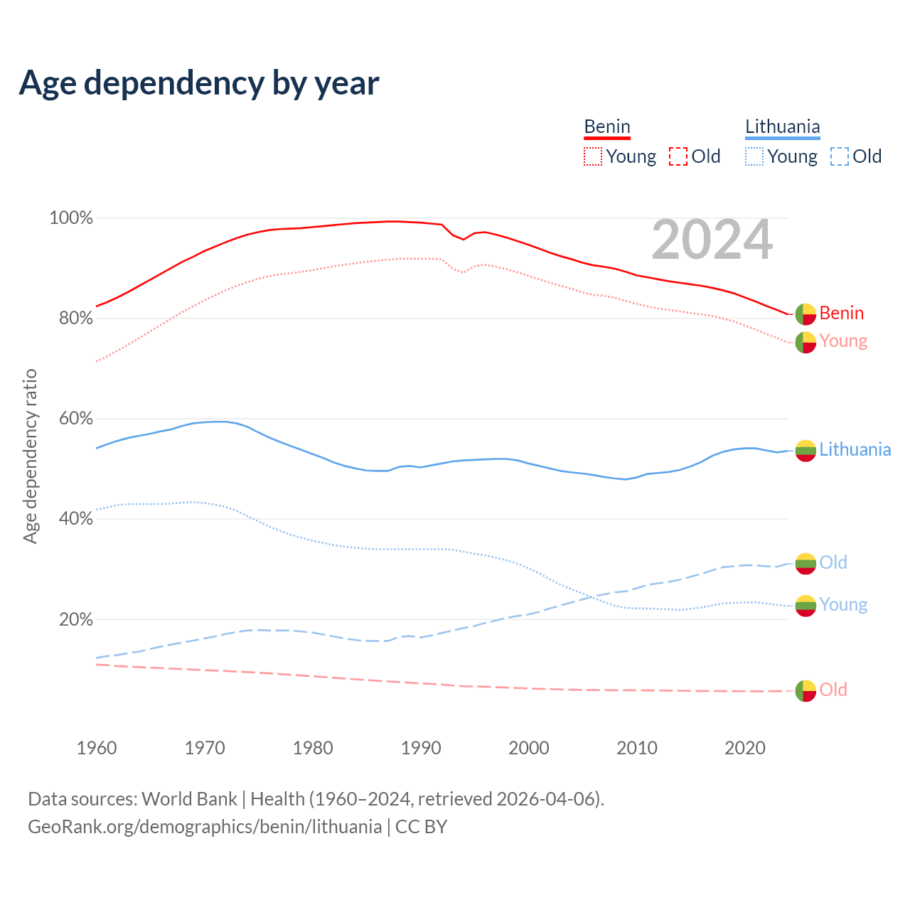 - The share of old-age demographic (65+) in Benin is 3.12% vs 20.2% in Lithuania.