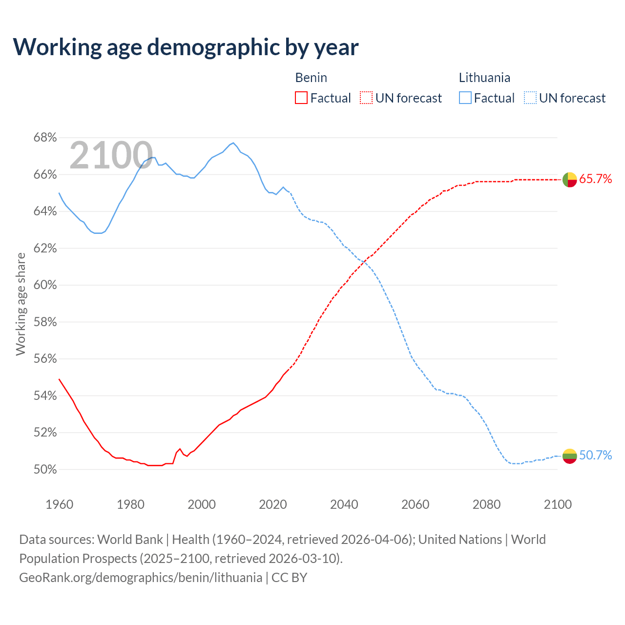 - As of 2026, the population of Benin is 15.3M vs 2.83M in Lithuania - 5.4 times difference.