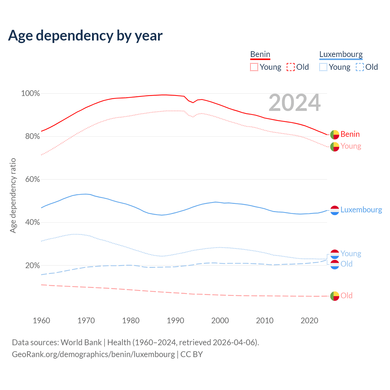 - The share of old-age demographic (65+) in Benin is 3.12% vs 15.5% in Luxembourg.