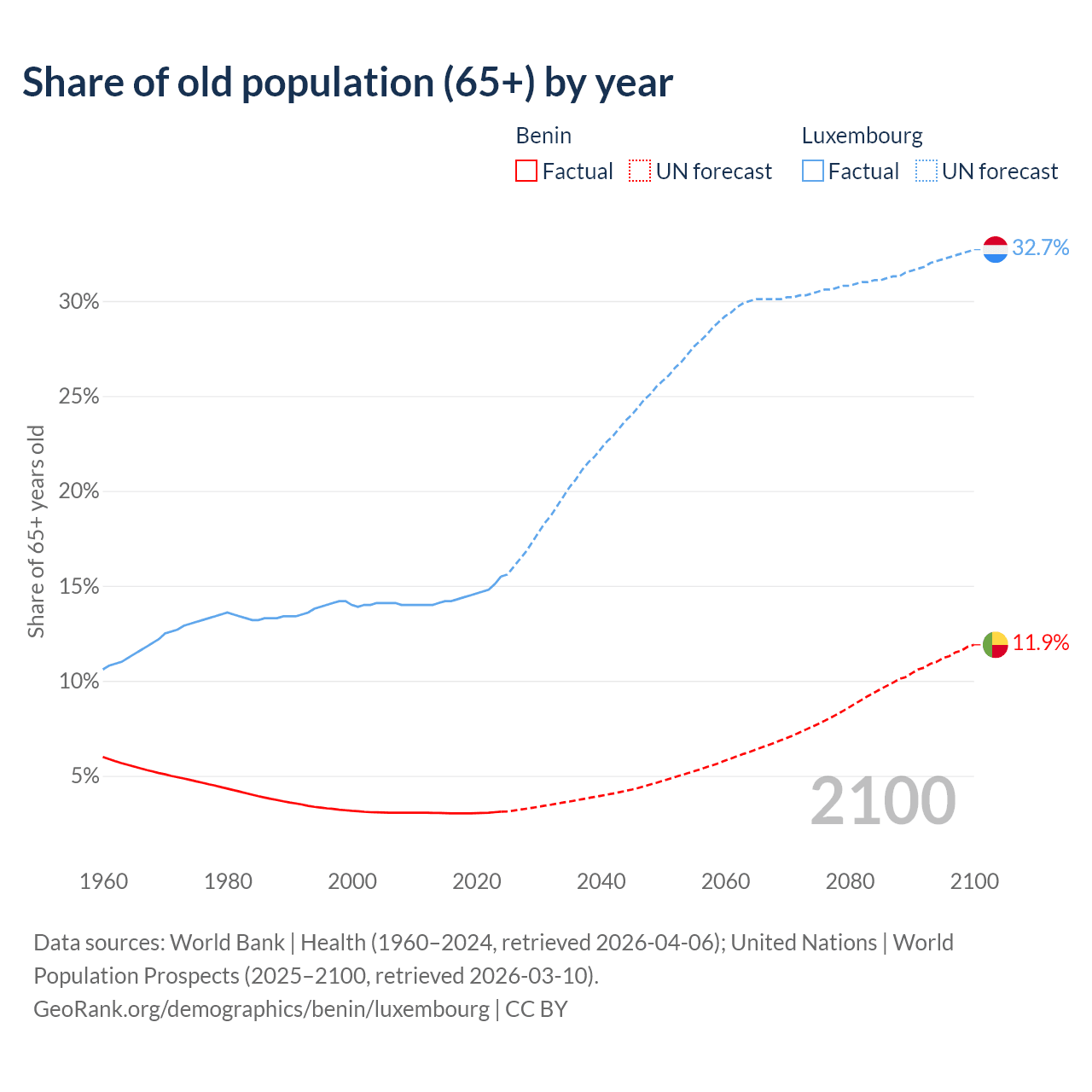The share of older people aged 65 and over is 3.12% in Benin and 15.5% in Luxembourg. Life expectancy in Benin compared to Luxembourg .