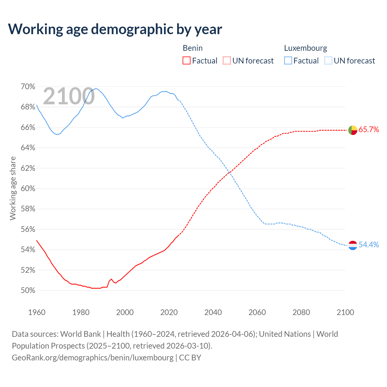 Median age Benin vs Luxembourg, 1960-2100