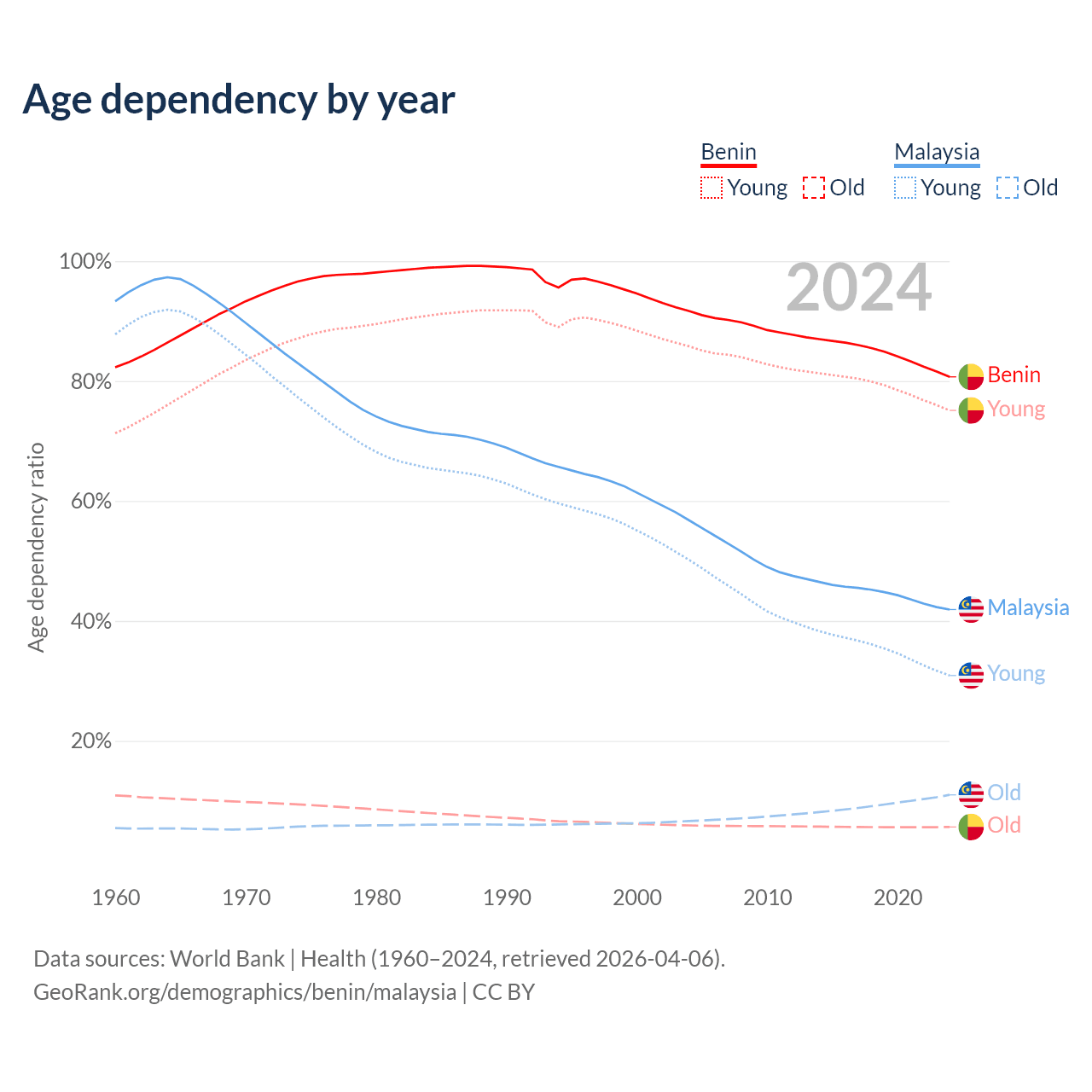 - Benin is ranked 179/196 by median age (oldest to youngest) vs 92/196 for Malaysia.