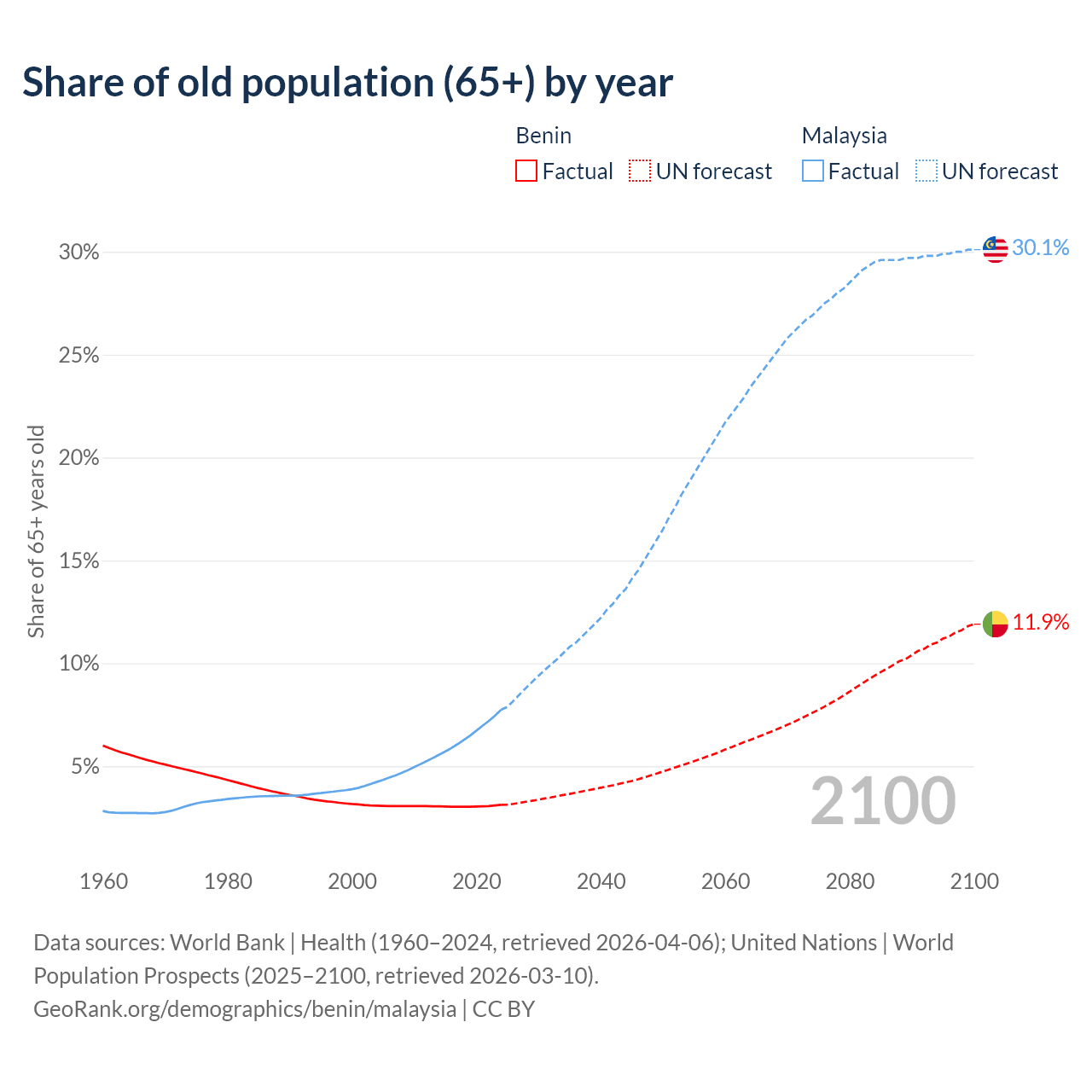 - The share of old-age demographic (65+) in Benin is 3.12% vs 7.74% in Malaysia.