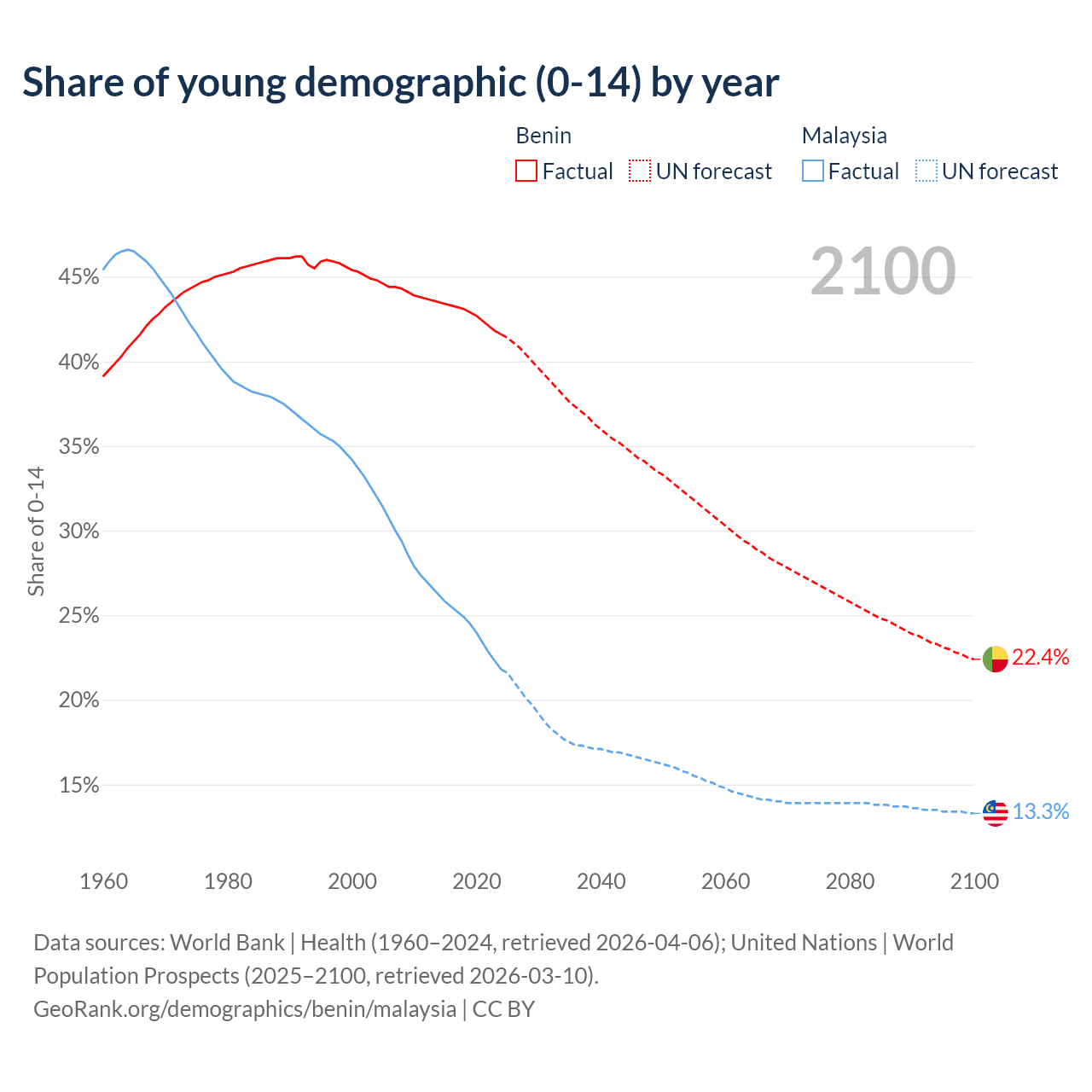 - The share of young demographic (0-15 years old) in Benin is 41.6% vs 21.8% in Malaysia.