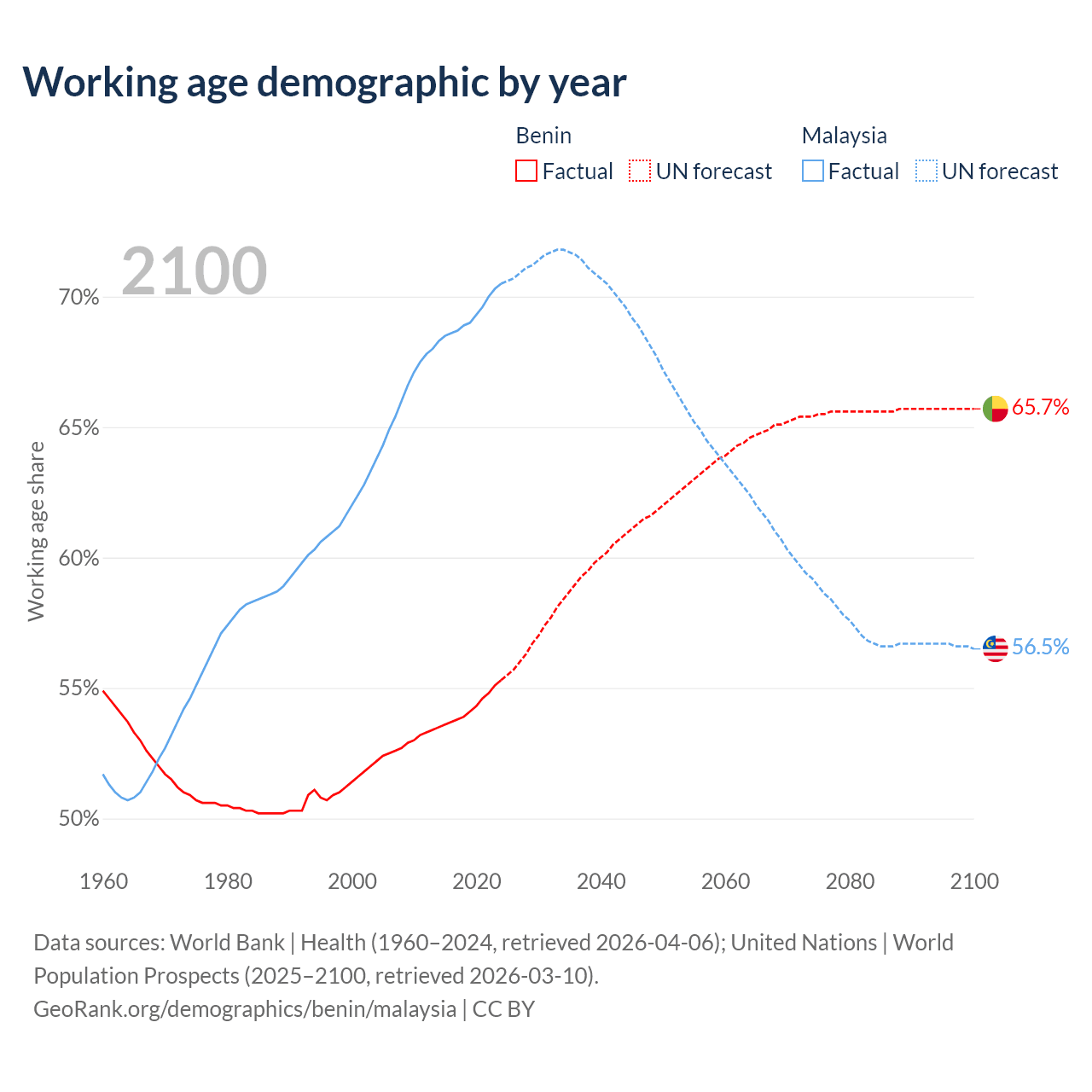 - Benin has 8.45M working age adults (aged 15-64) vs 25.7M in Malaysia.