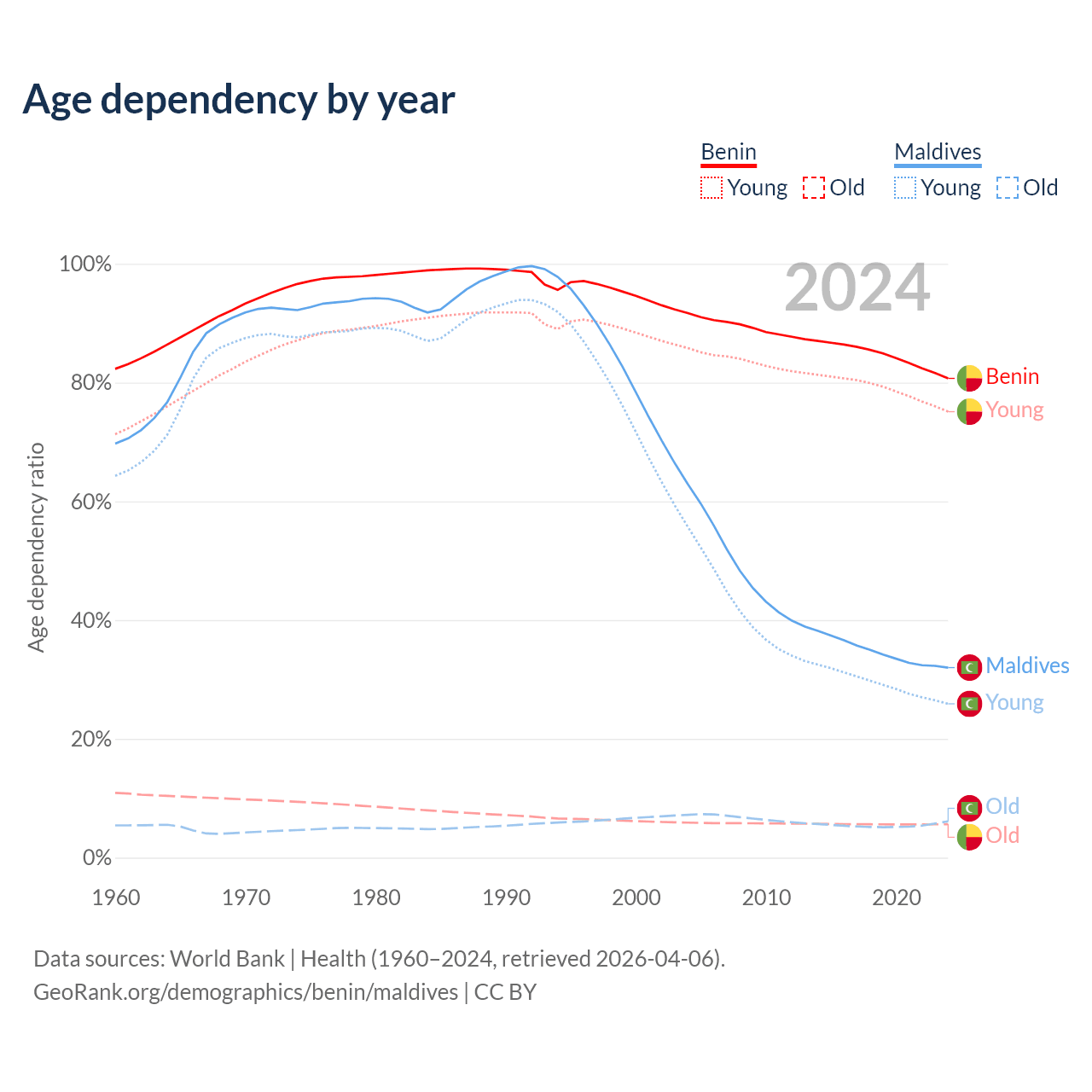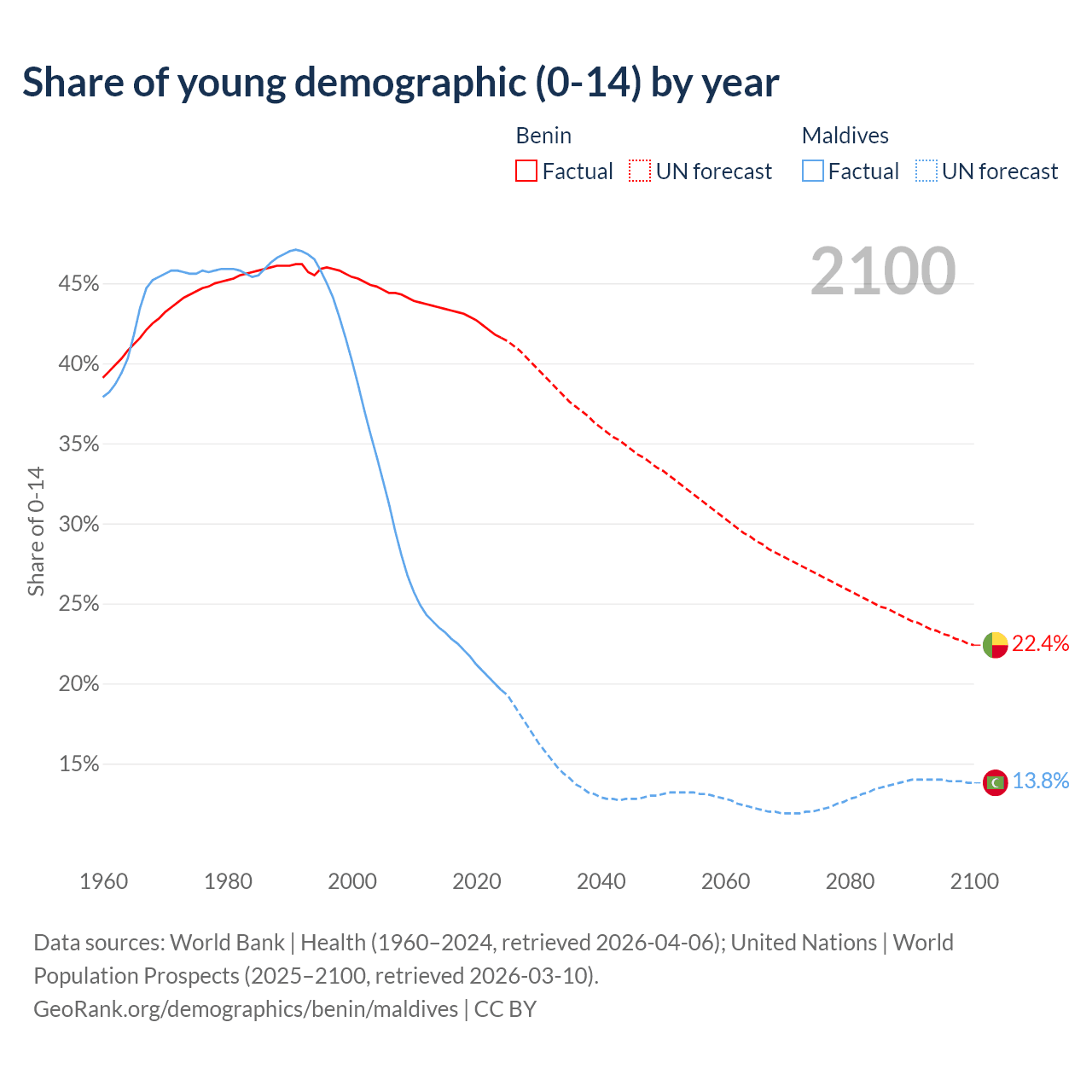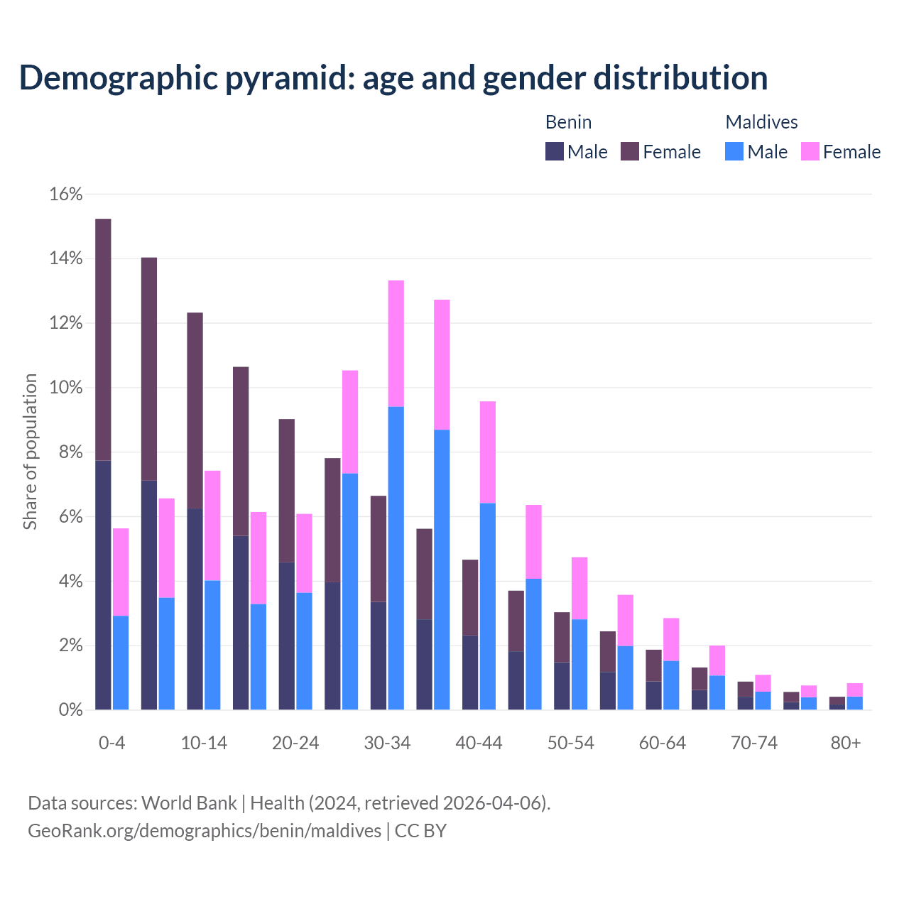 - The share of young demographic (0-15 years old) in Benin is 41.6% vs 19.6% in Maldives.
