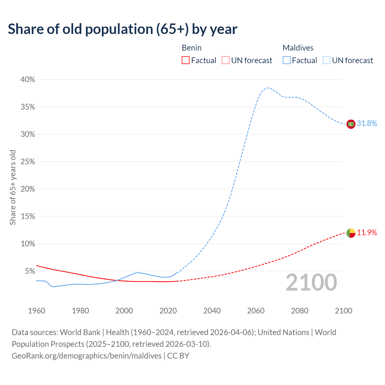 The share of older people aged 65 and over is 3.12% in Benin and 4.64% in Maldives. Life expectancy in Benin compared to Maldives .