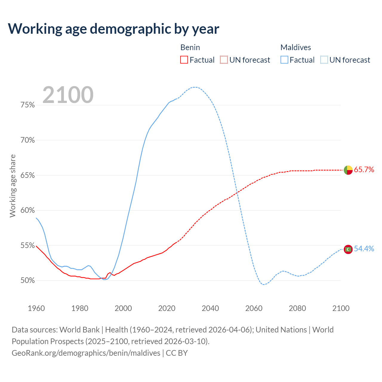 Median age Benin vs Maldives, 1960-2100