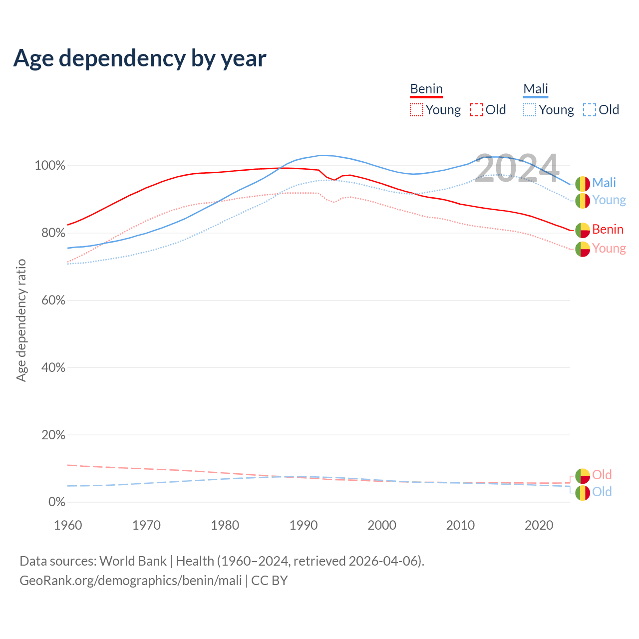 - Benin is ranked 179/196 by median age (oldest to youngest) vs 193/196 for Mali.