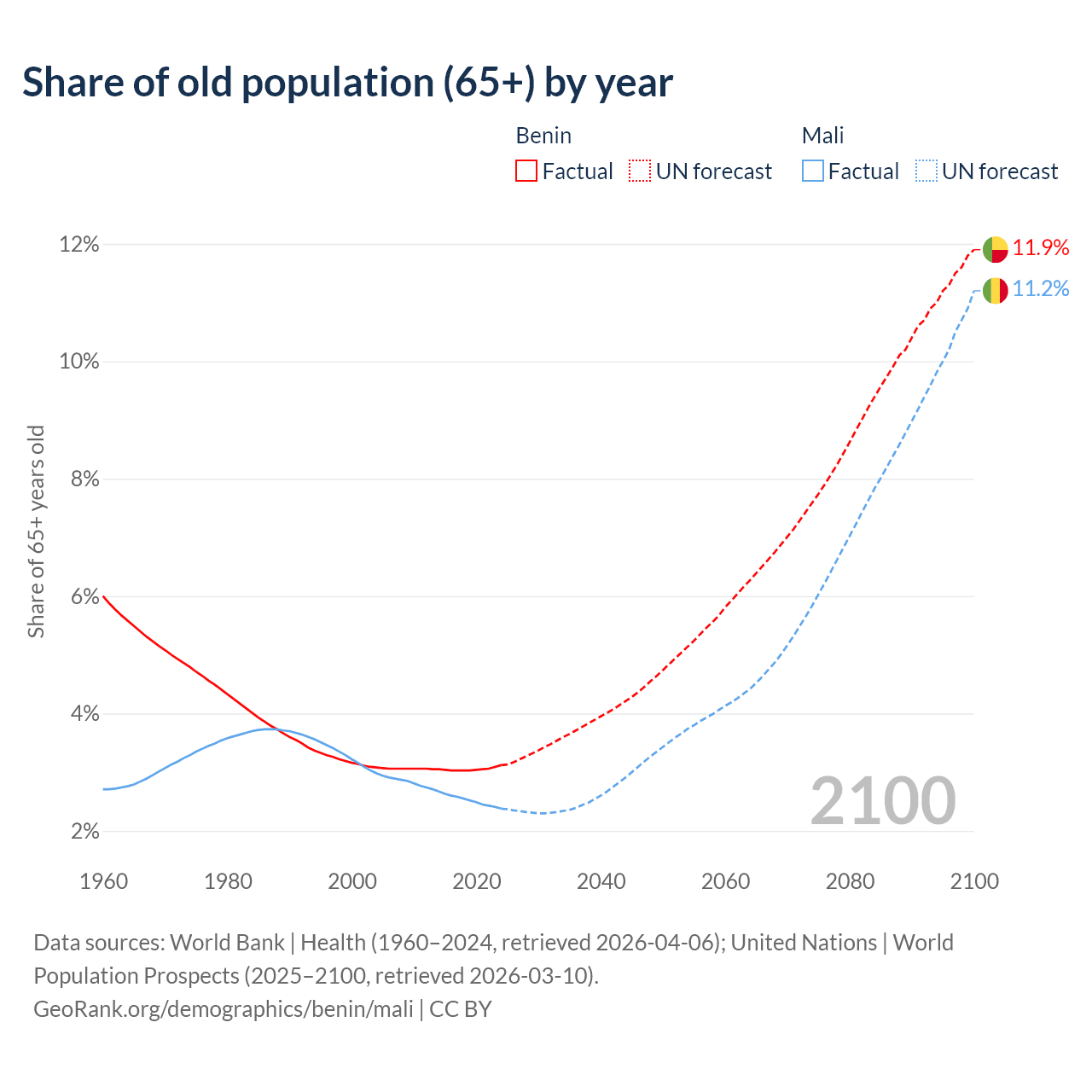 - The share of old-age demographic (65+) in Benin is 3.12% vs 2.38% in Mali.