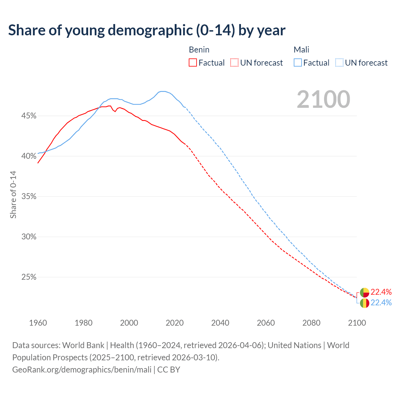 Median age Benin vs Mali, 1960-2100