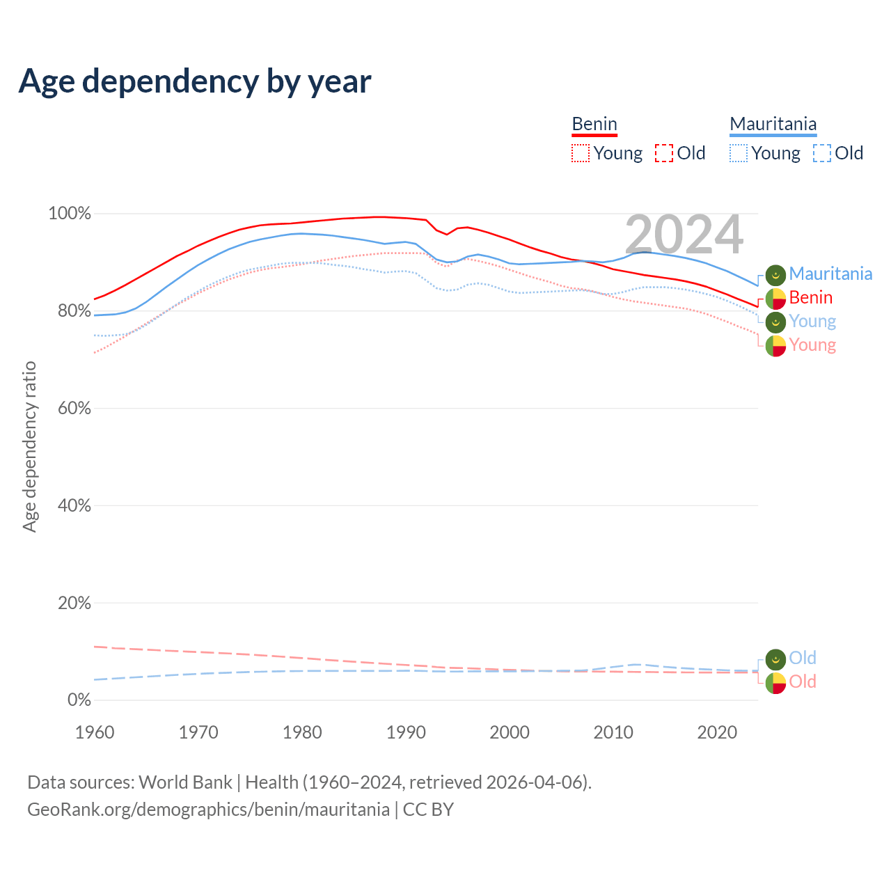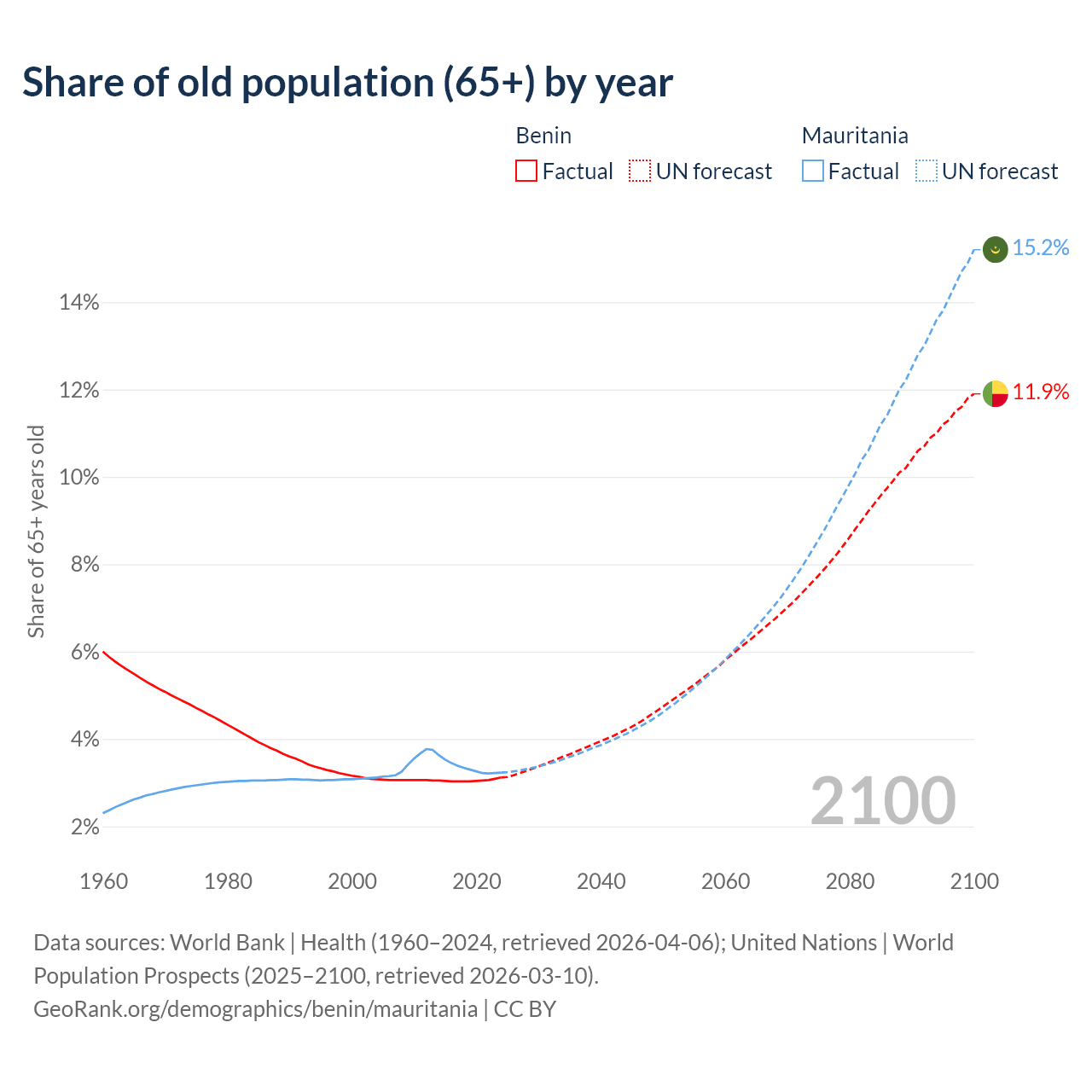 - The share of old-age demographic (65+) in Benin is 3.12% vs 3.23% in Mauritania.