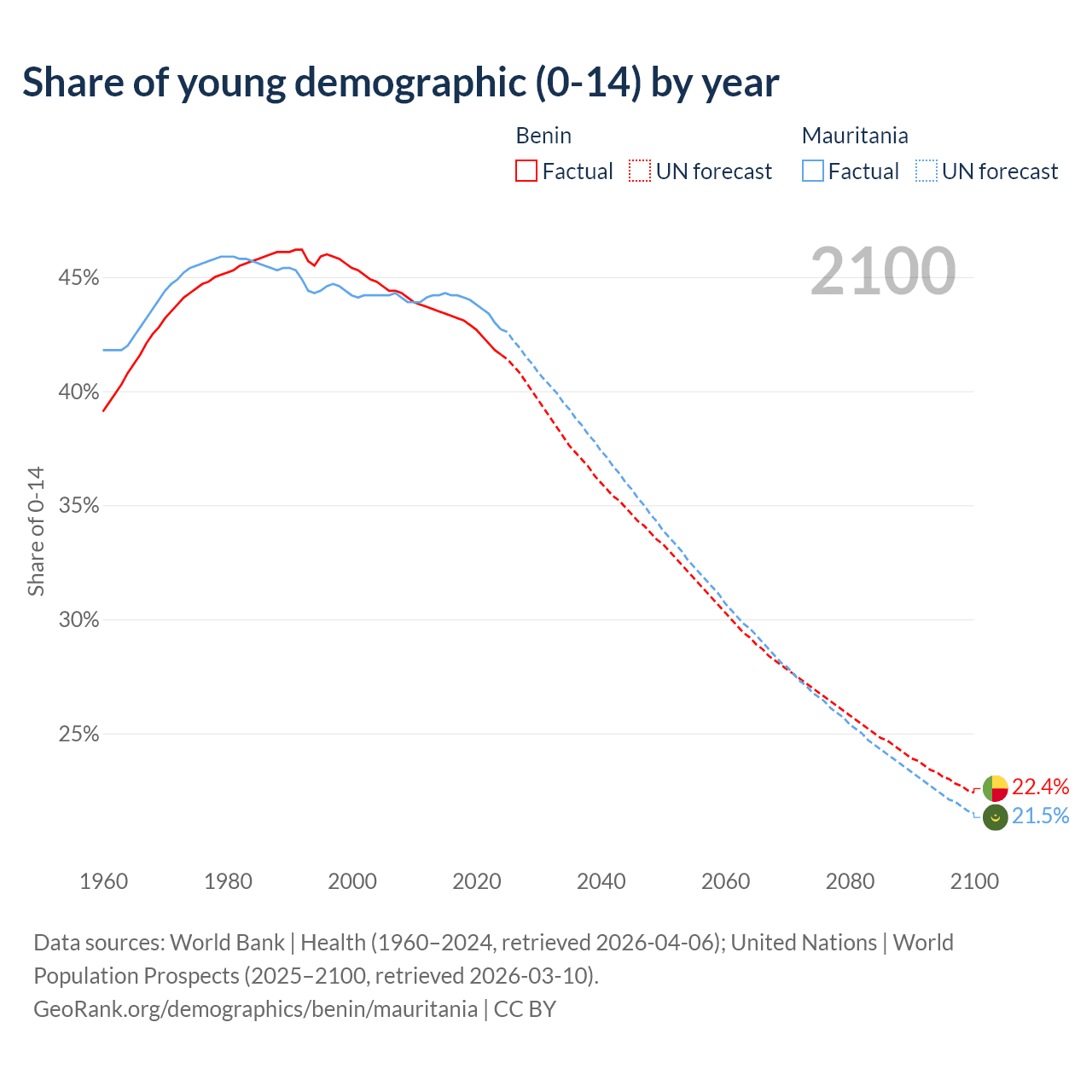 Median age Benin vs Mauritania, 1960-2100