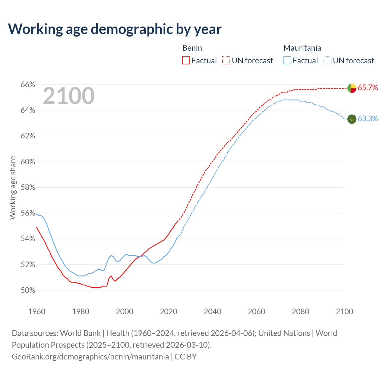 - Benin has 8.45M working age adults (aged 15-64) vs 2.98M in Mauritania.