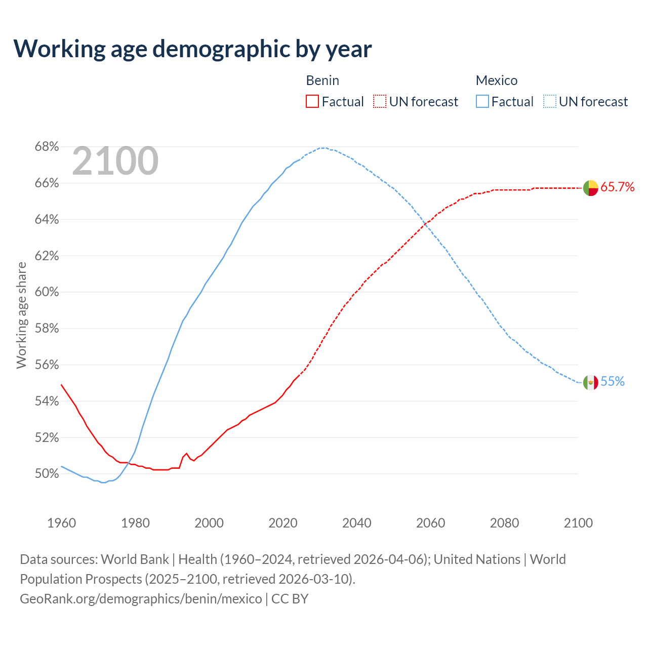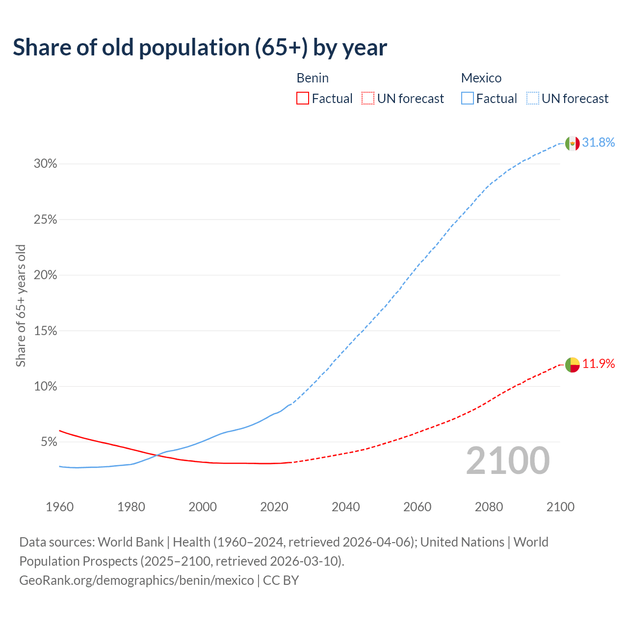 The share of older people aged 65 and over is 3.12% in Benin and 8.25% in Mexico. Life expectancy in Benin compared to Mexico .