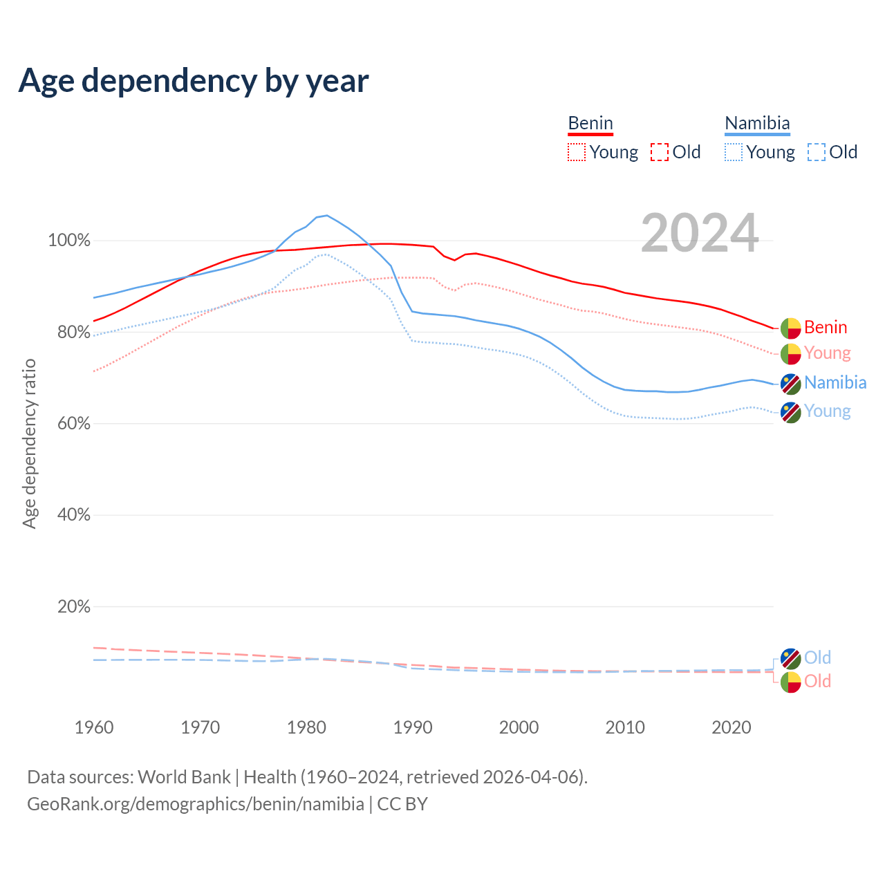 - Benin is ranked 179/196 by median age (oldest to youngest) vs 147/196 for Namibia.