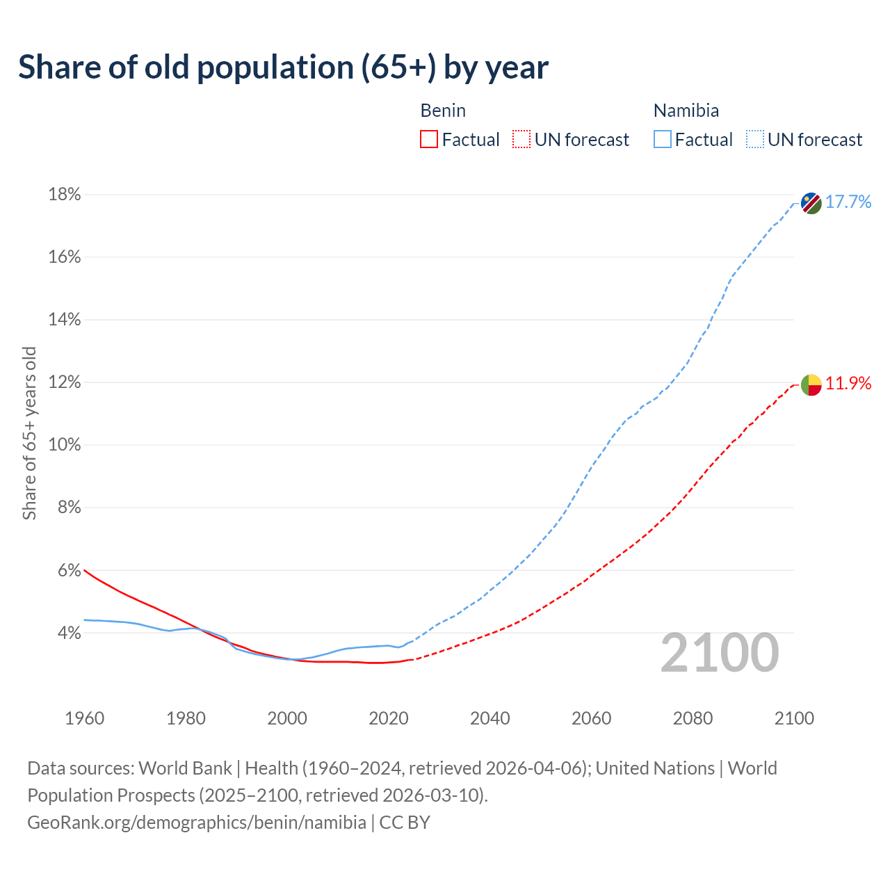 The share of older people aged 65 and over is 3.12% in Benin and 3.67% in Namibia. Life expectancy in Benin compared to Namibia .
