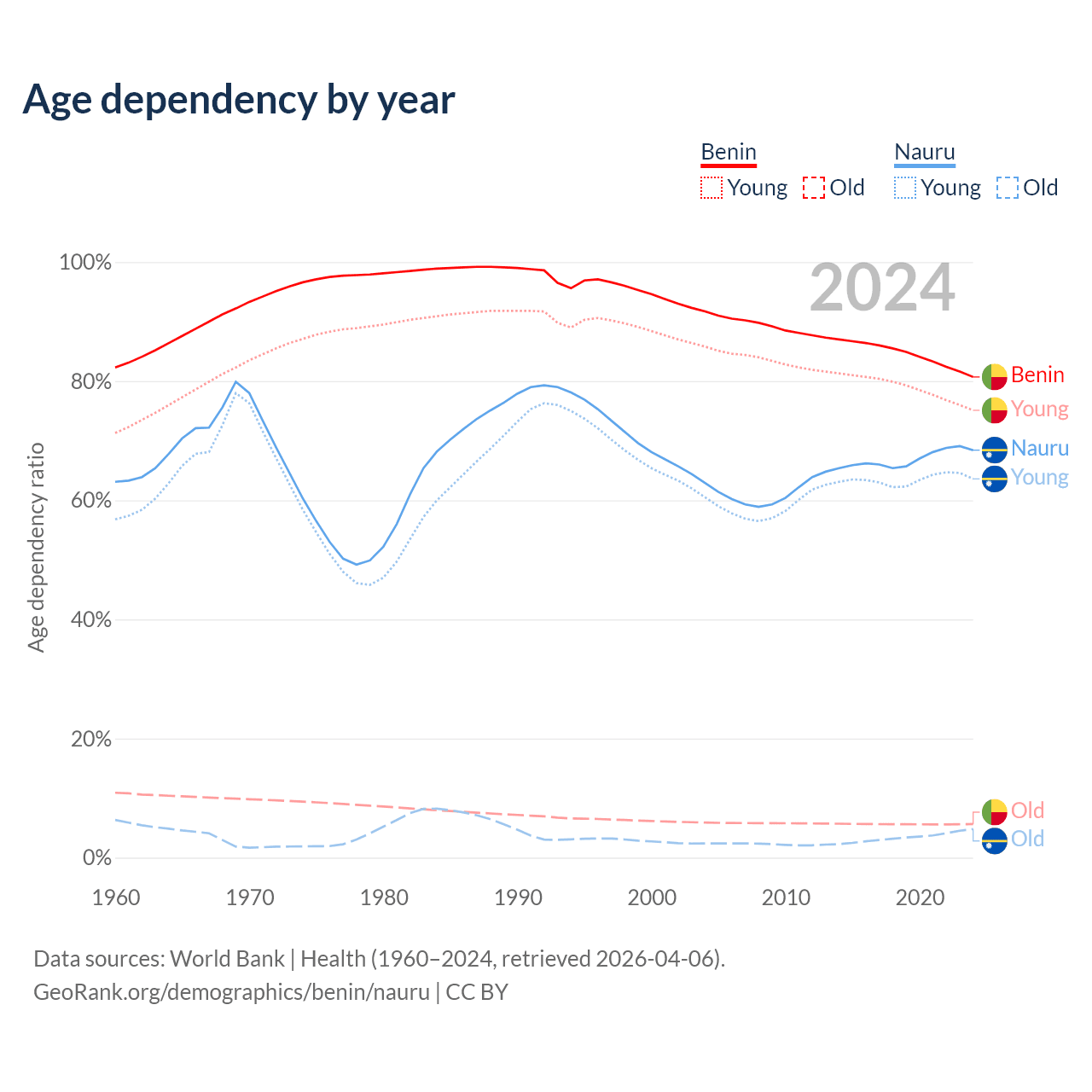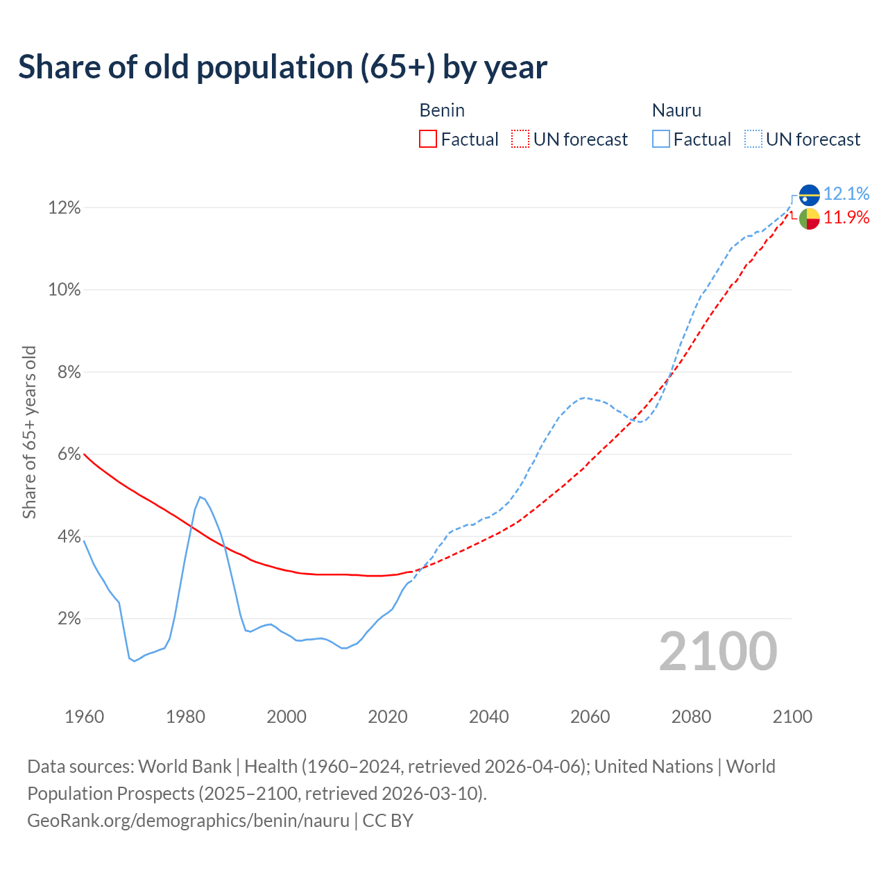 - The share of old-age demographic (65+) in Benin is 3.12% vs 2.85% in Nauru.