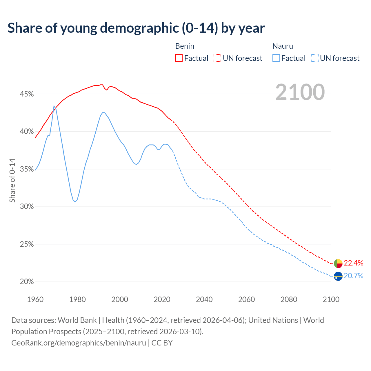 - The share of young demographic (0-15 years old) in Benin is 41.6% vs 37.8% in Nauru.