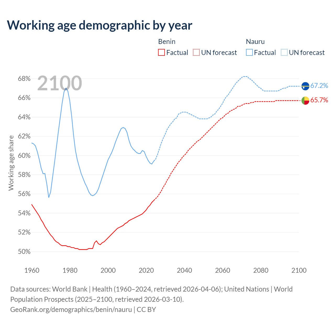 Median age Benin vs Nauru, 1960-2100