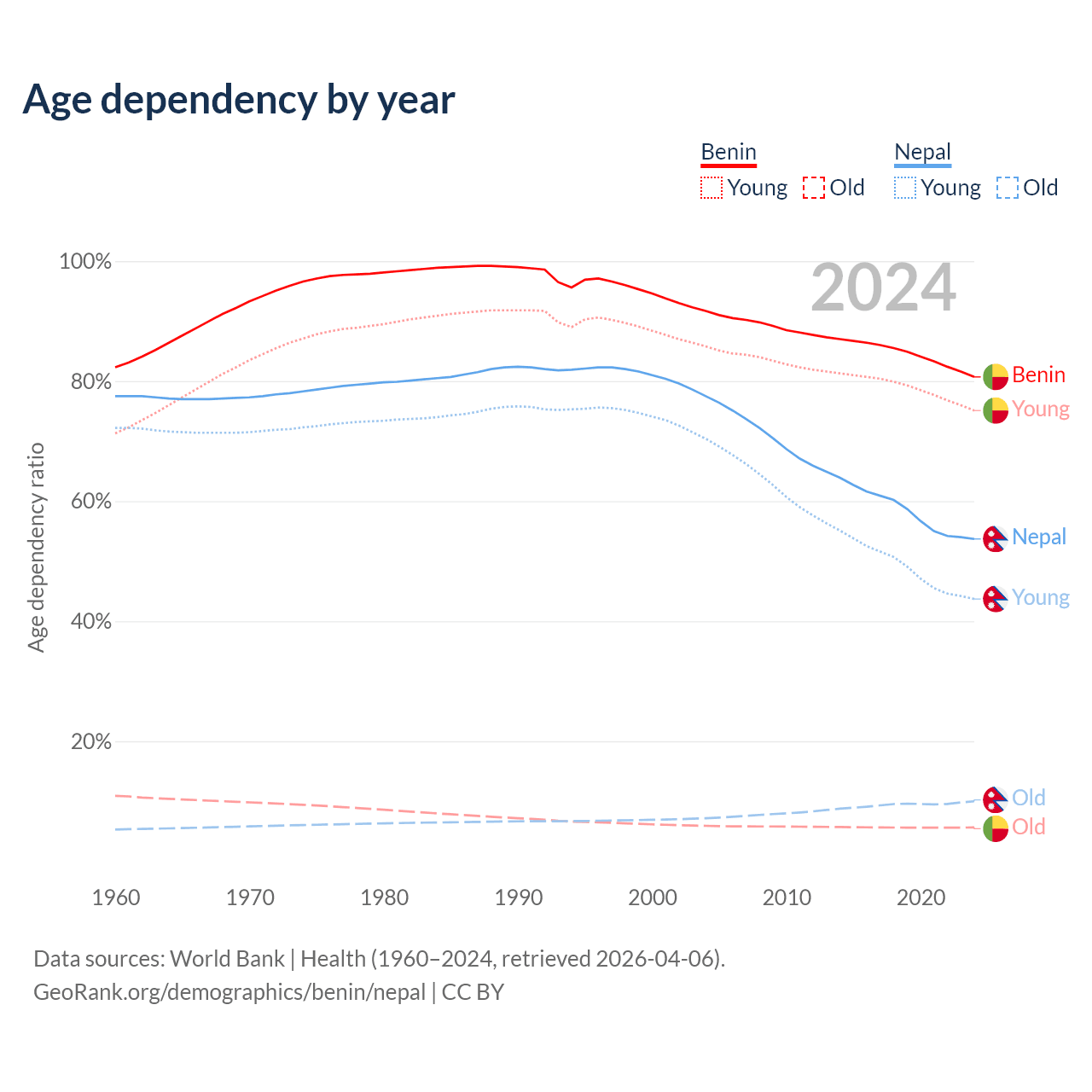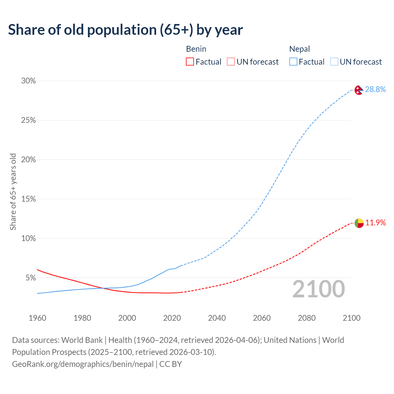 - The share of old-age demographic (65+) in Benin is 3.12% vs 6.5% in Nepal.