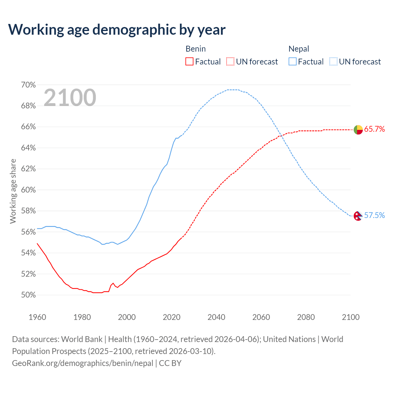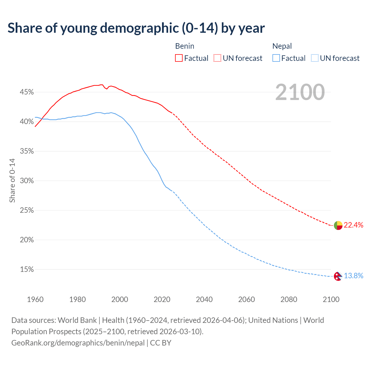 - The share of young demographic (0-15 years old) in Benin is 41.6% vs 28.4% in Nepal.