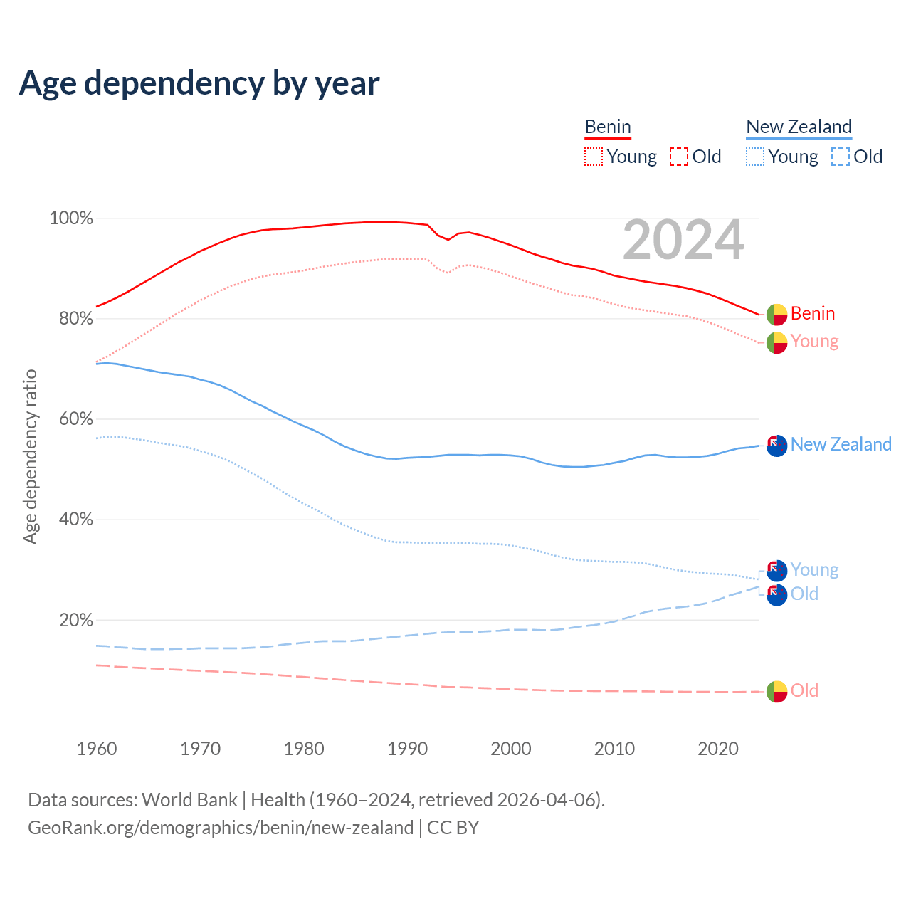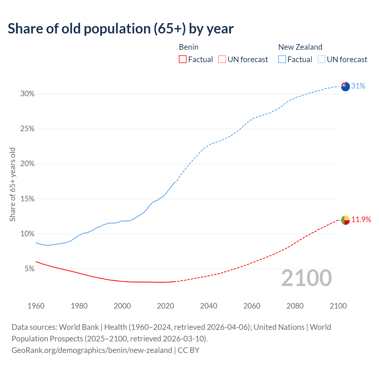- The share of old-age demographic (65+) in Benin is 3.12% vs 17.2% in New Zealand.