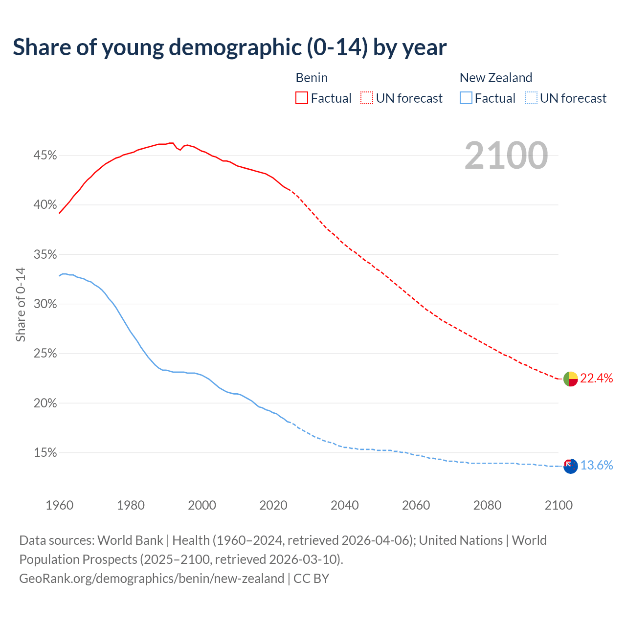 - The share of young demographic (0-15 years old) in Benin is 41.6% vs 18.1% in New Zealand.
