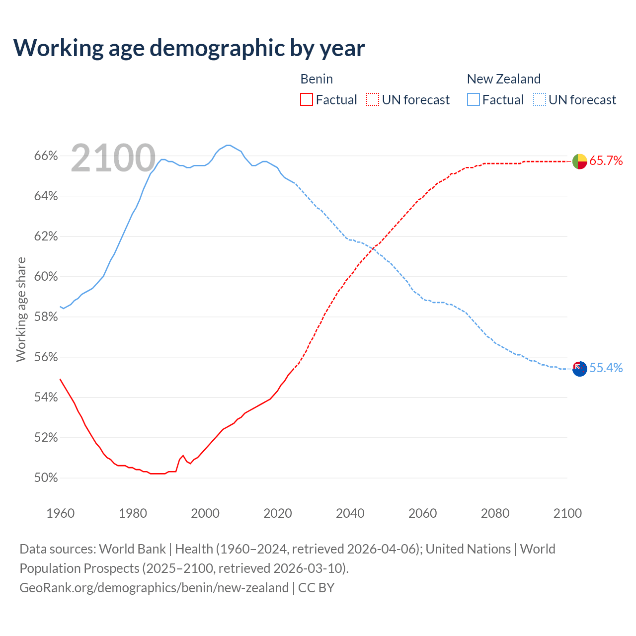 Median age Benin vs New Zealand, 1960-2100