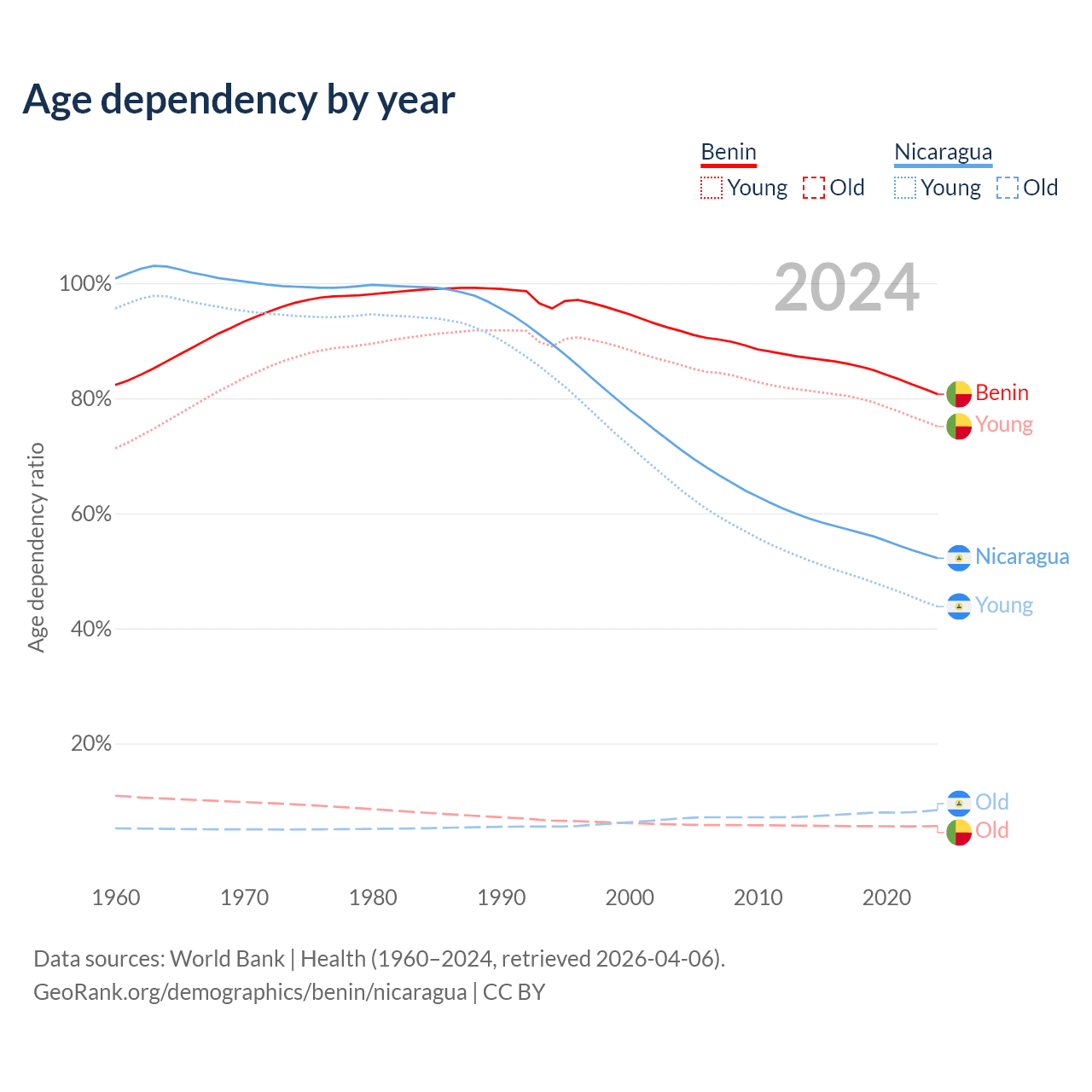 - The share of old-age demographic (65+) in Benin is 3.12% vs 5.53% in Nicaragua.