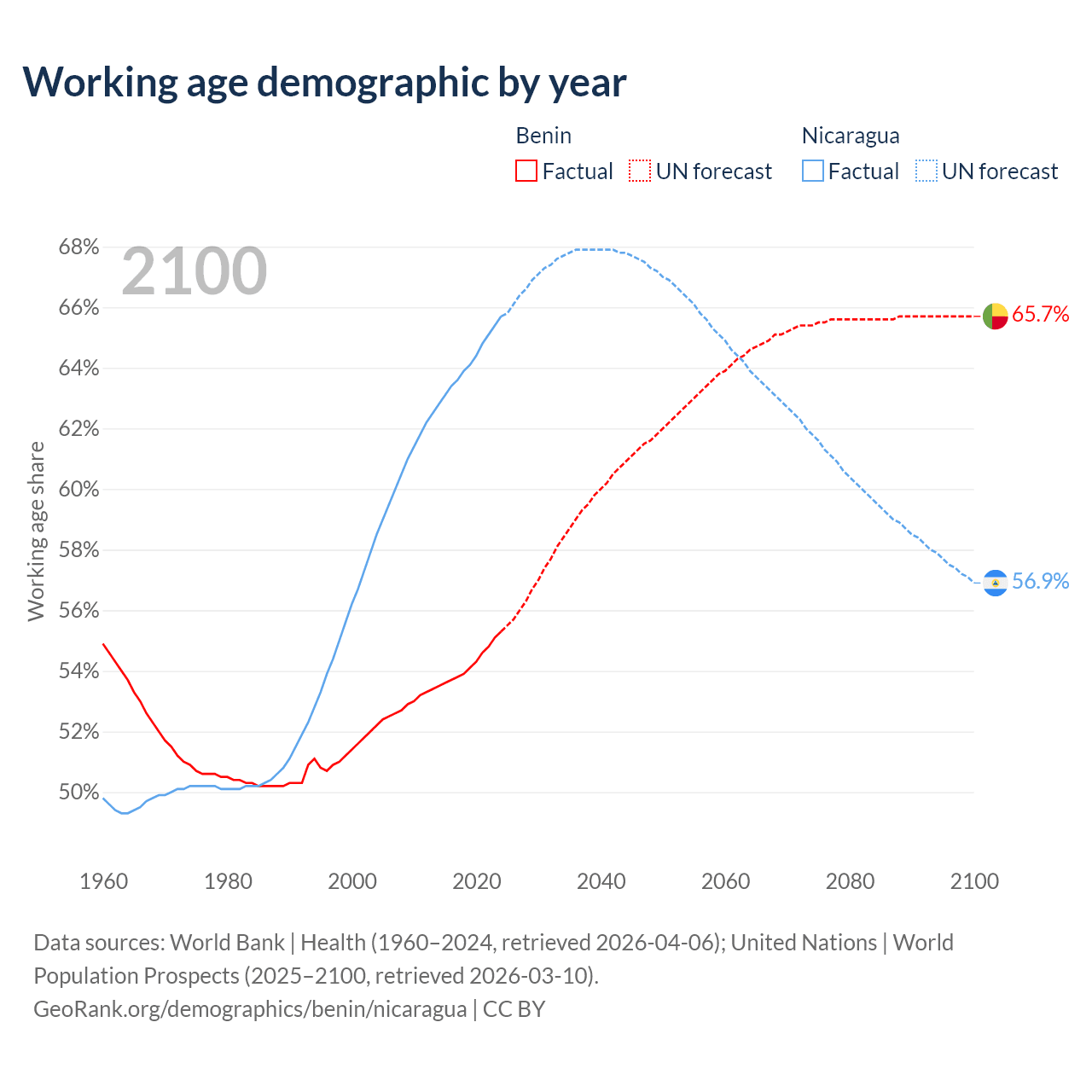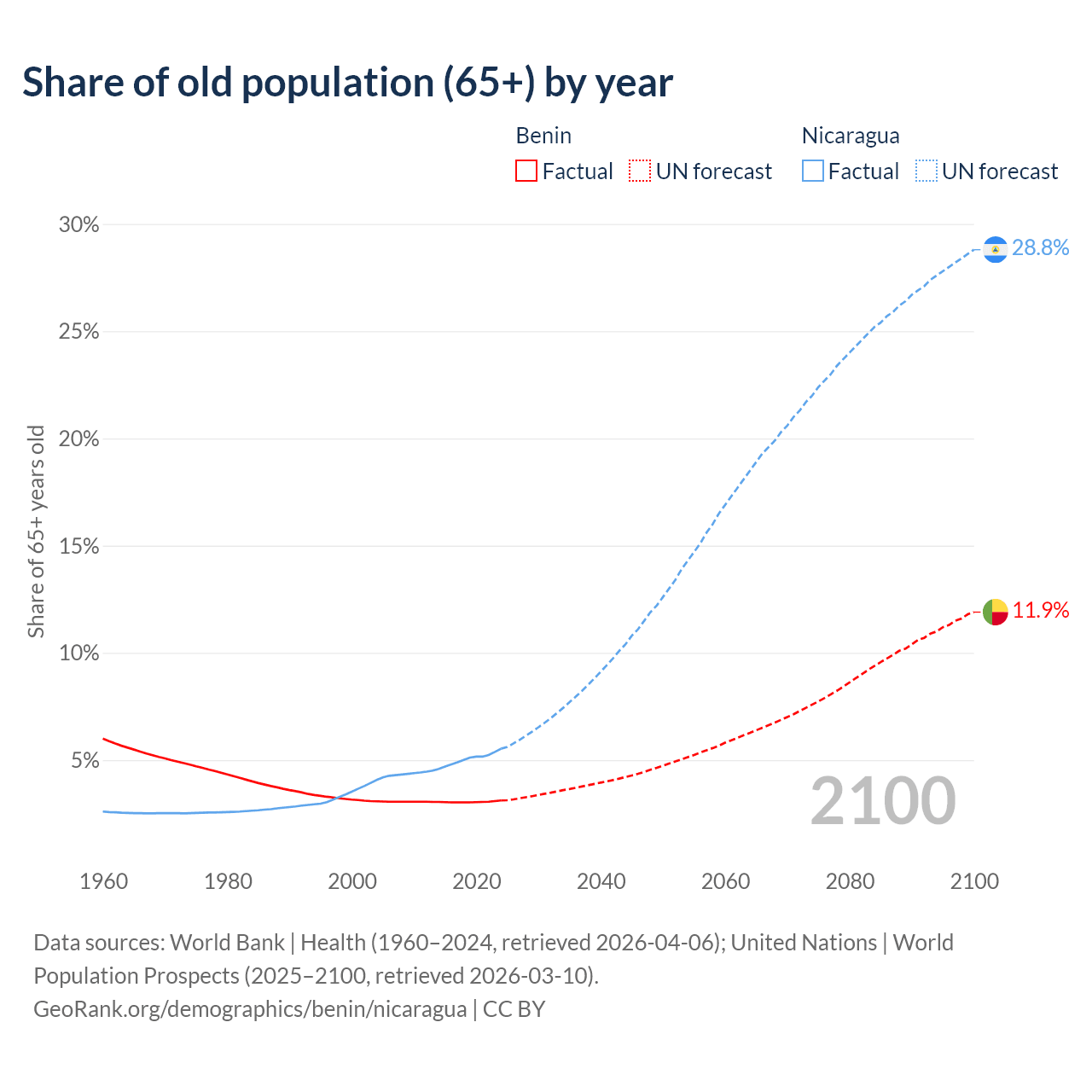 The share of older people aged 65 and over is 3.12% in Benin and 5.53% in Nicaragua. Life expectancy in Benin compared to Nicaragua .