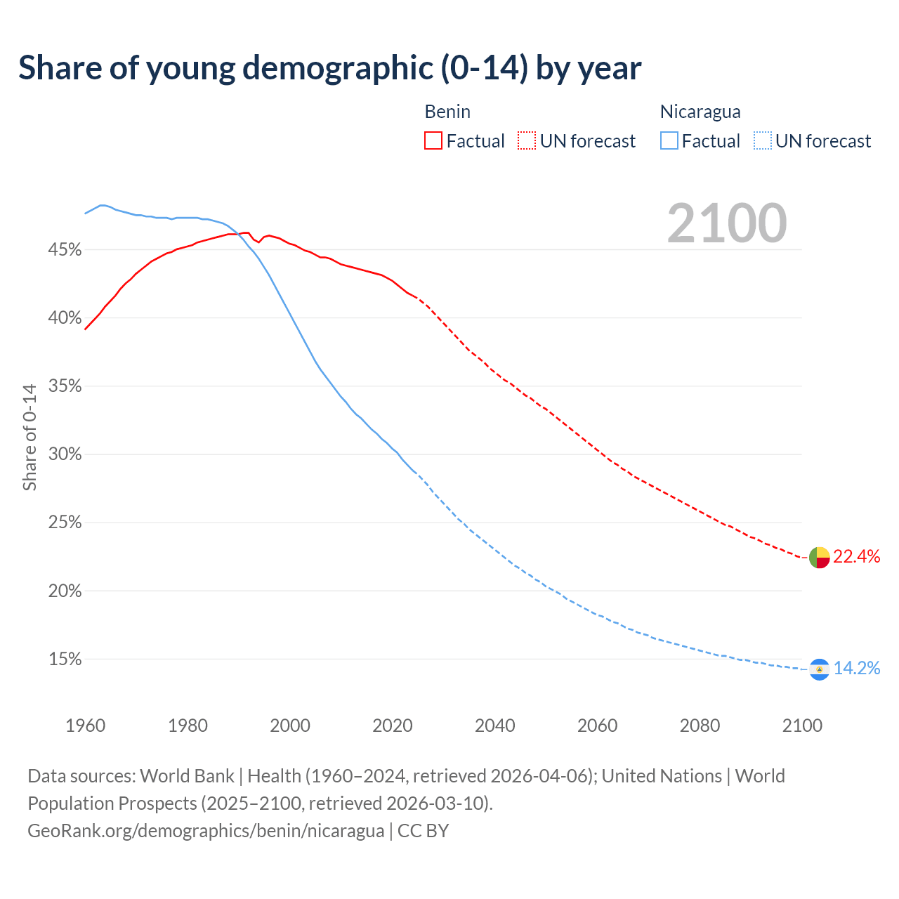 - The share of young demographic (0-15 years old) in Benin is 41.6% vs 28.8% in Nicaragua.