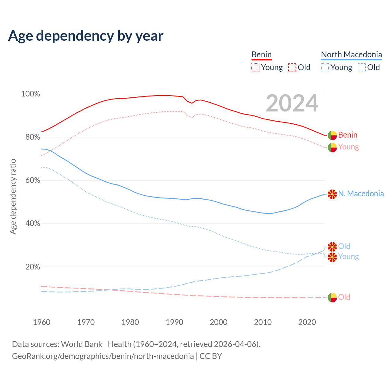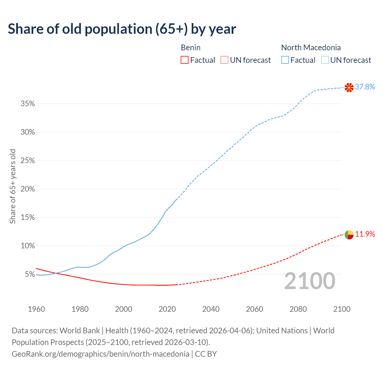 The share of older people aged 65 and over is 3.12% in Benin and 18% in North Macedonia. Life expectancy in Benin compared to North Macedonia .