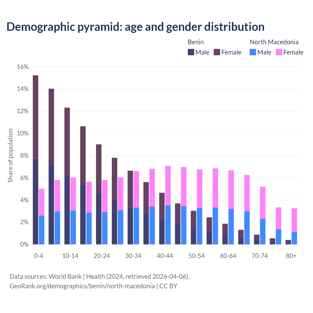- The share of young demographic (0-15 years old) in Benin is 41.6% vs 16.8% in North Macedonia.