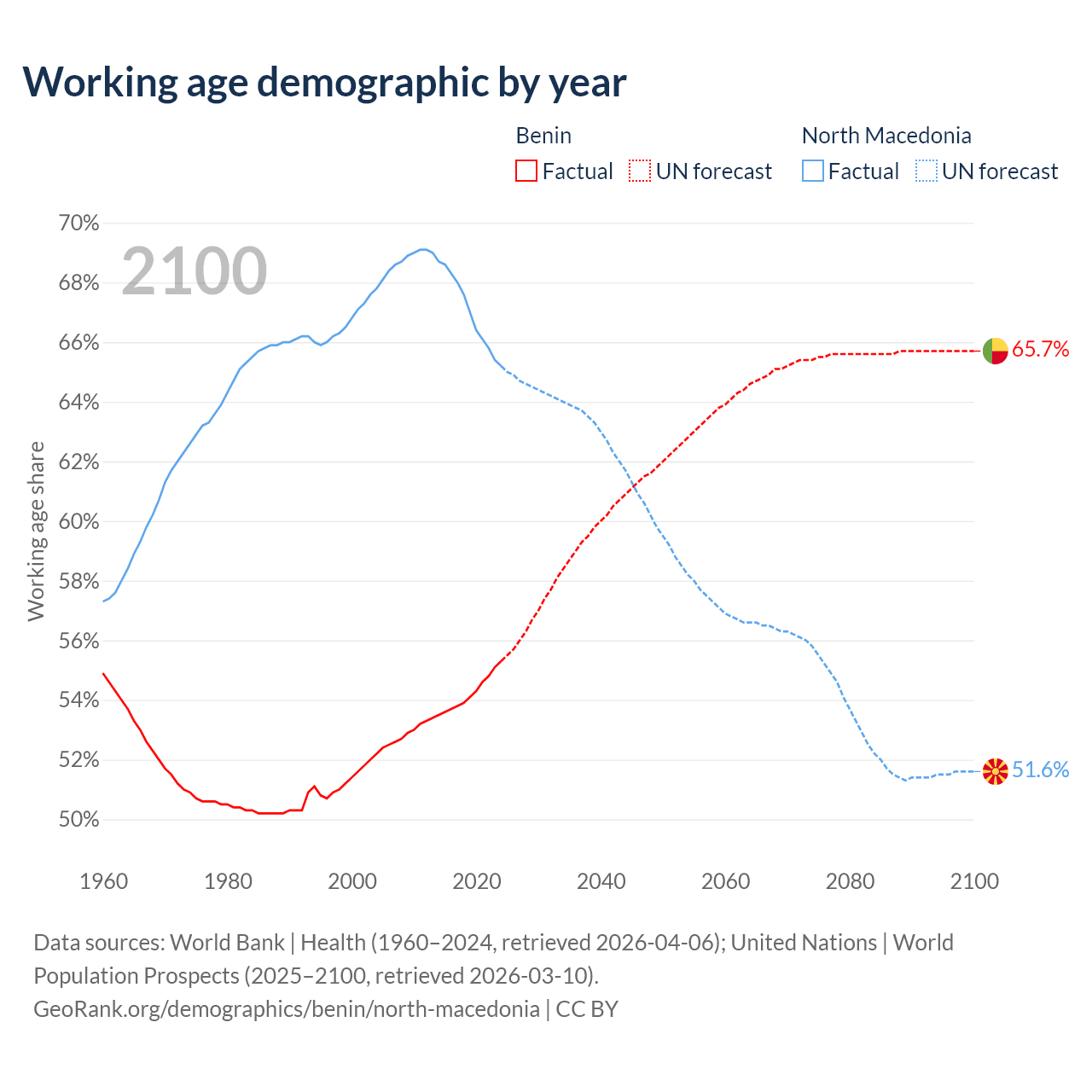 - Benin has 8.45M working age adults (aged 15-64) vs 1.18M in North Macedonia.