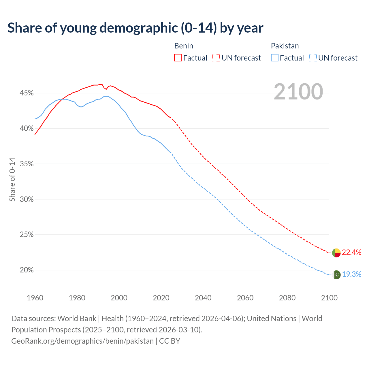 - As of 2026, the population of Benin is 15.3M vs 260M in Pakistan - 17 times difference.