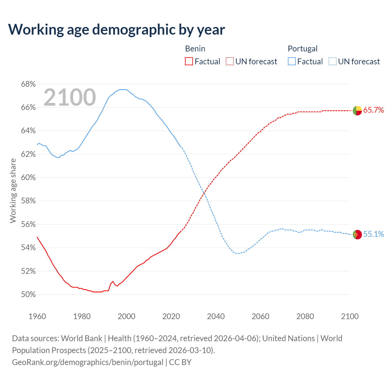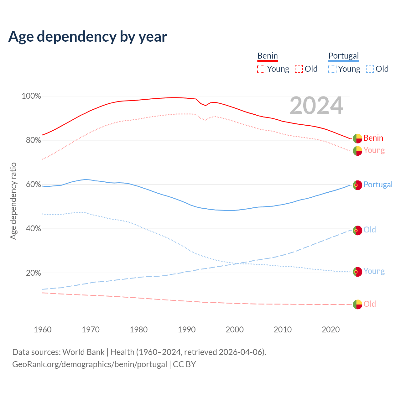 The share of older people aged 65 and over is 3.12% in Benin and 24.5% in Portugal. Life expectancy in Benin compared to Portugal .