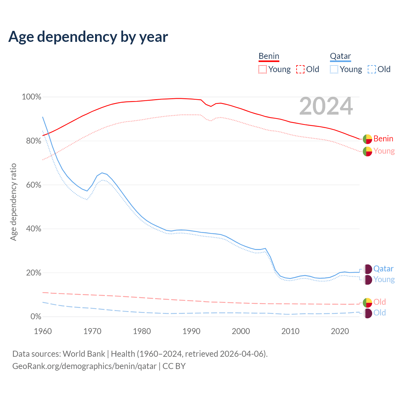 - Benin is ranked 179/196 by median age (oldest to youngest) vs 78/196 for Qatar.