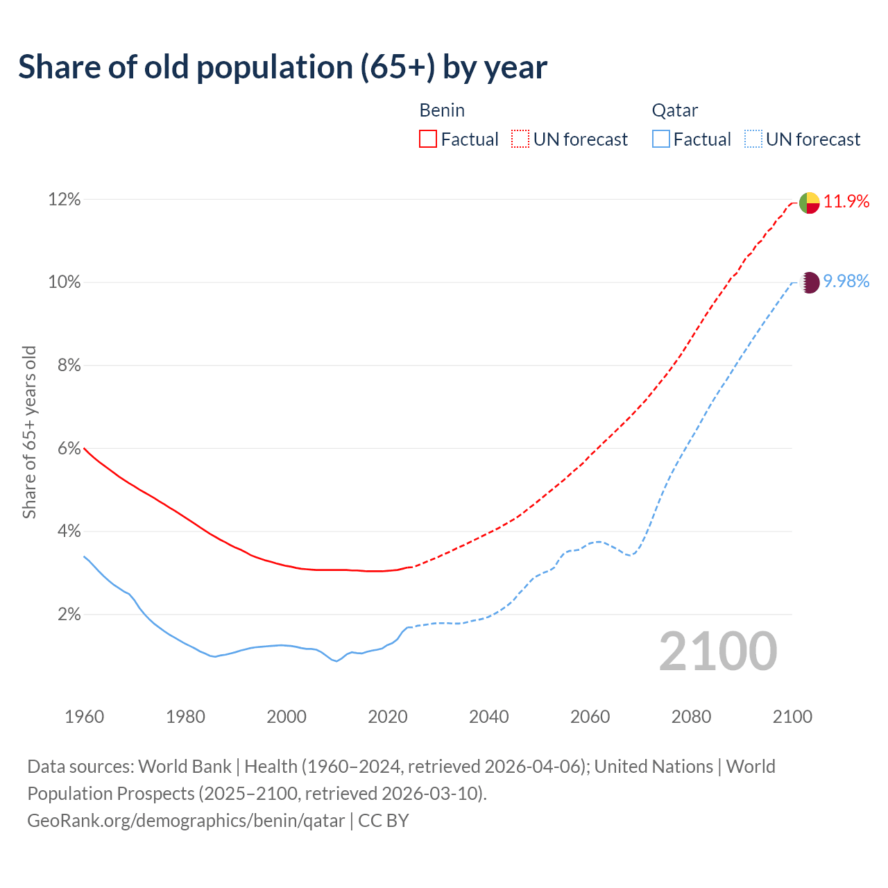 The share of older people aged 65 and over is 3.12% in Benin and 1.68% in Qatar. Life expectancy in Benin compared to Qatar .