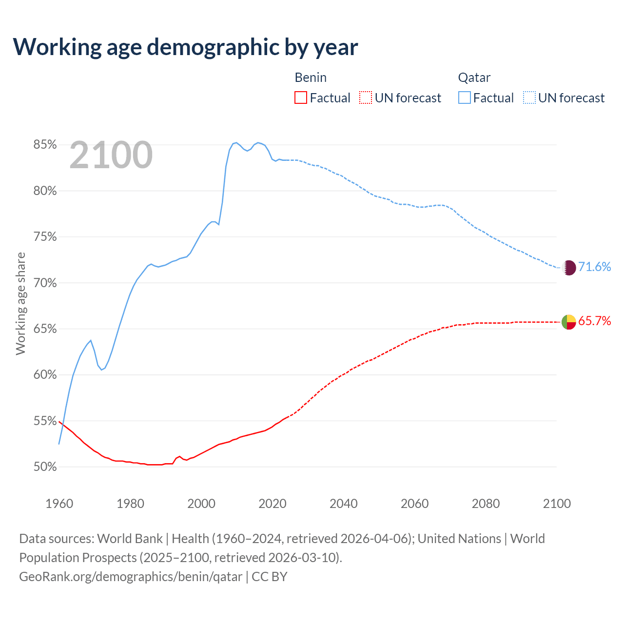 - Benin has 8.45M working age adults (aged 15-64) vs 2.5M in Qatar.