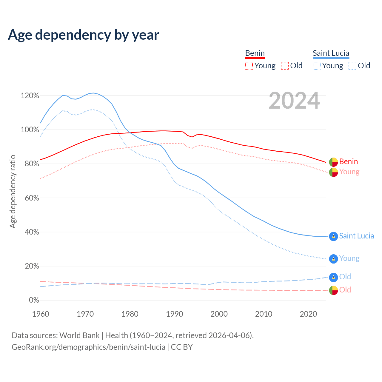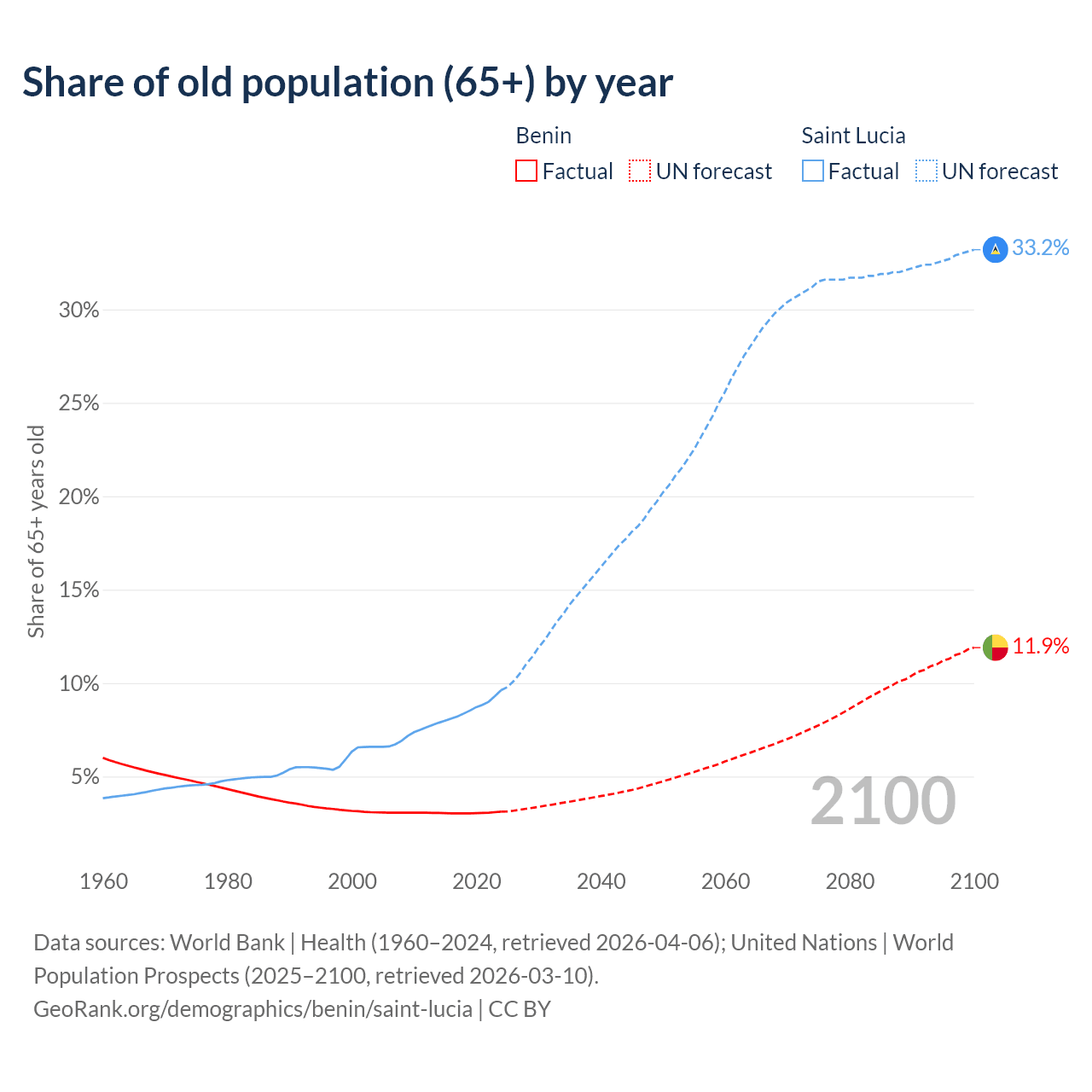 - The share of old-age demographic (65+) in Benin is 3.12% vs 9.62% in Saint Lucia.