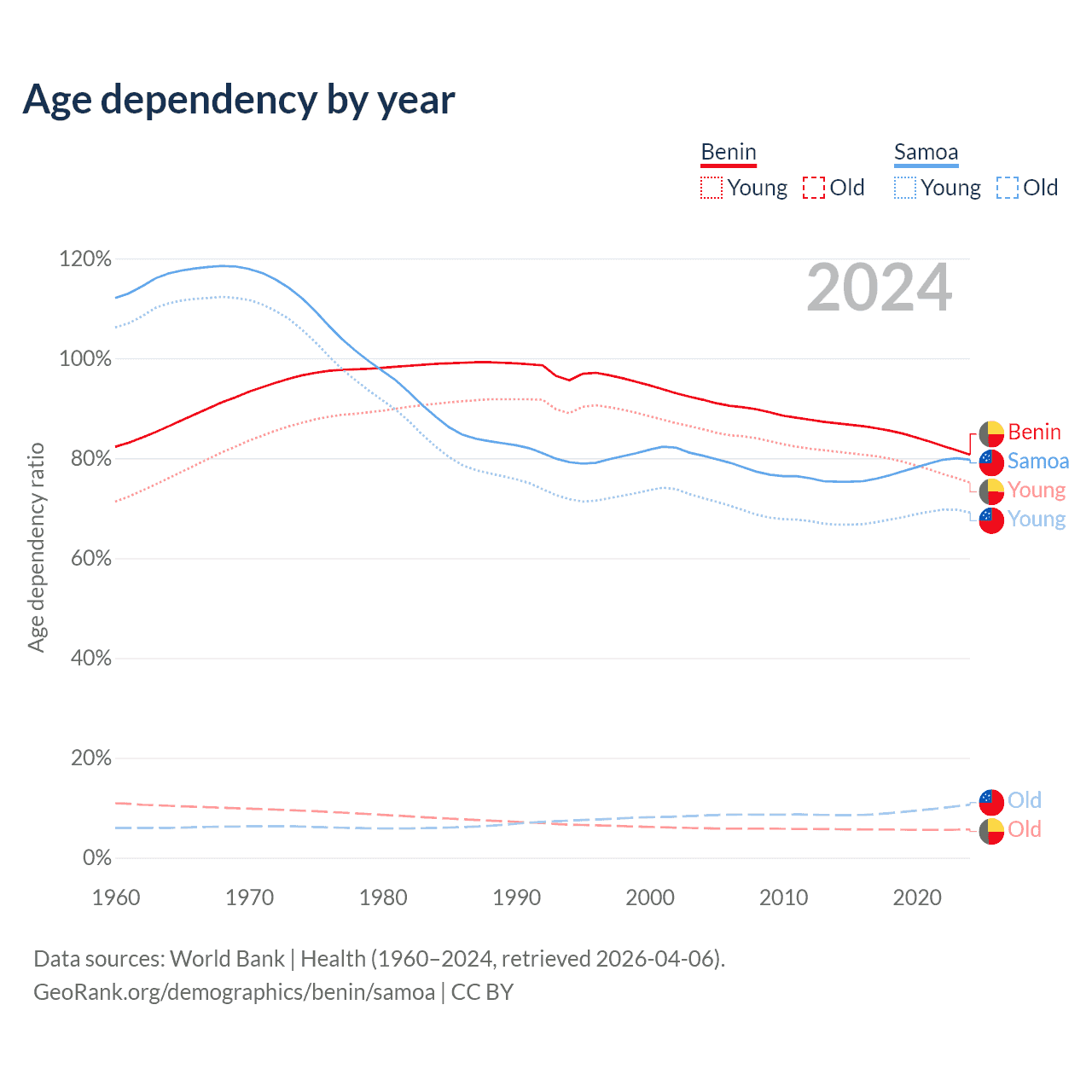 - The share of old-age demographic (65+) in Benin is 3.12% vs 5.88% in Samoa.