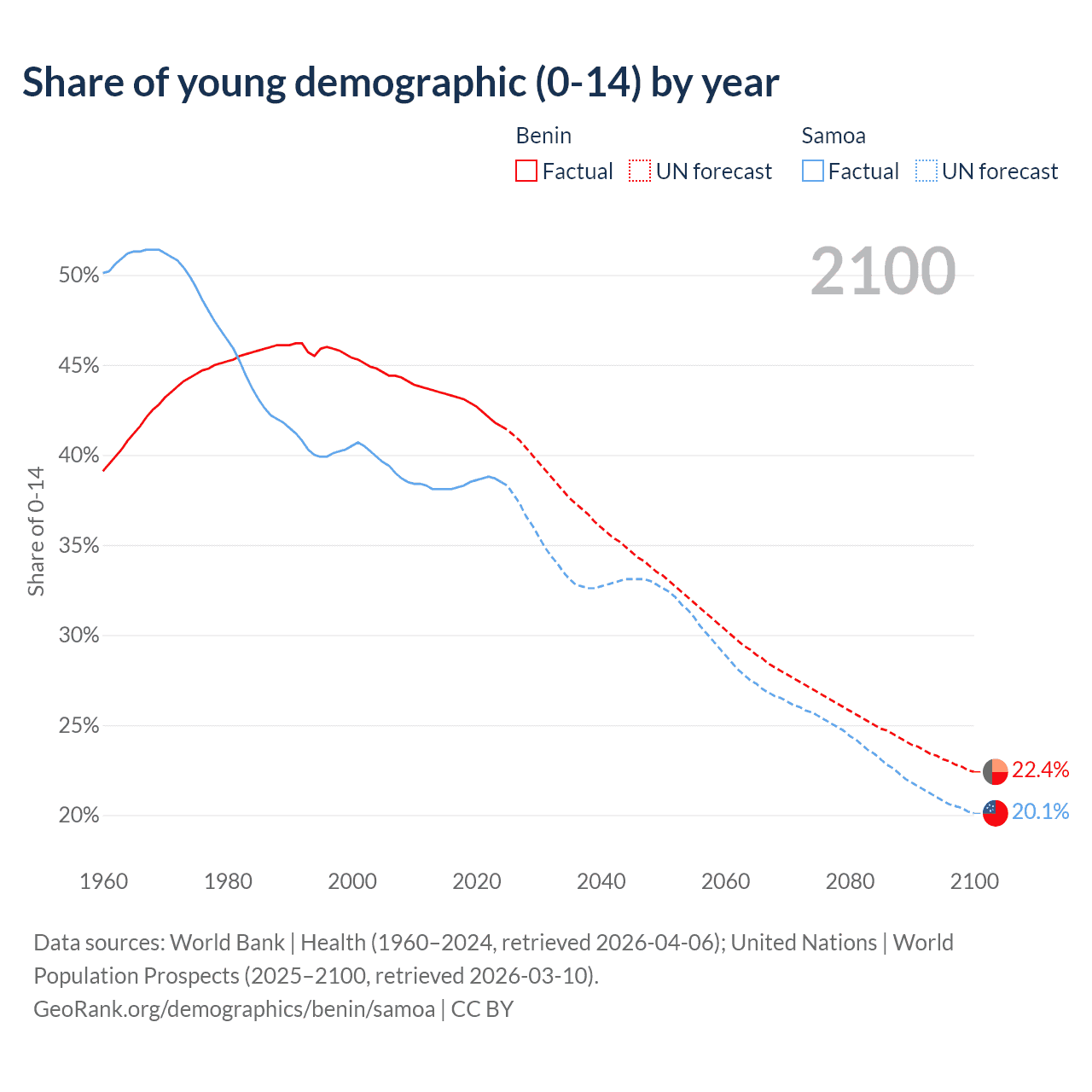 - The share of young demographic (0-15 years old) in Benin is 41.6% vs 38.5% in Samoa.