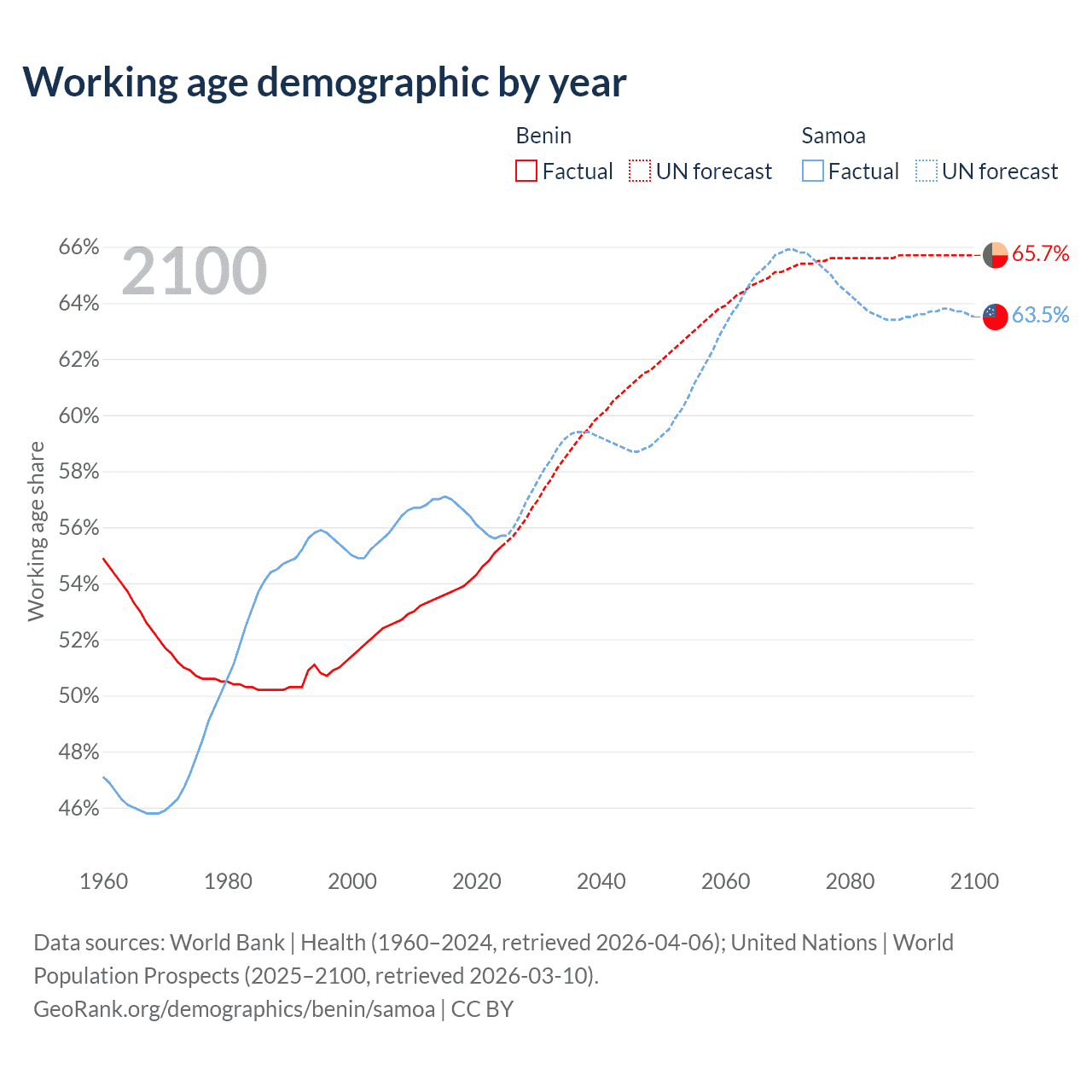Median age Benin vs Samoa, 1960-2100